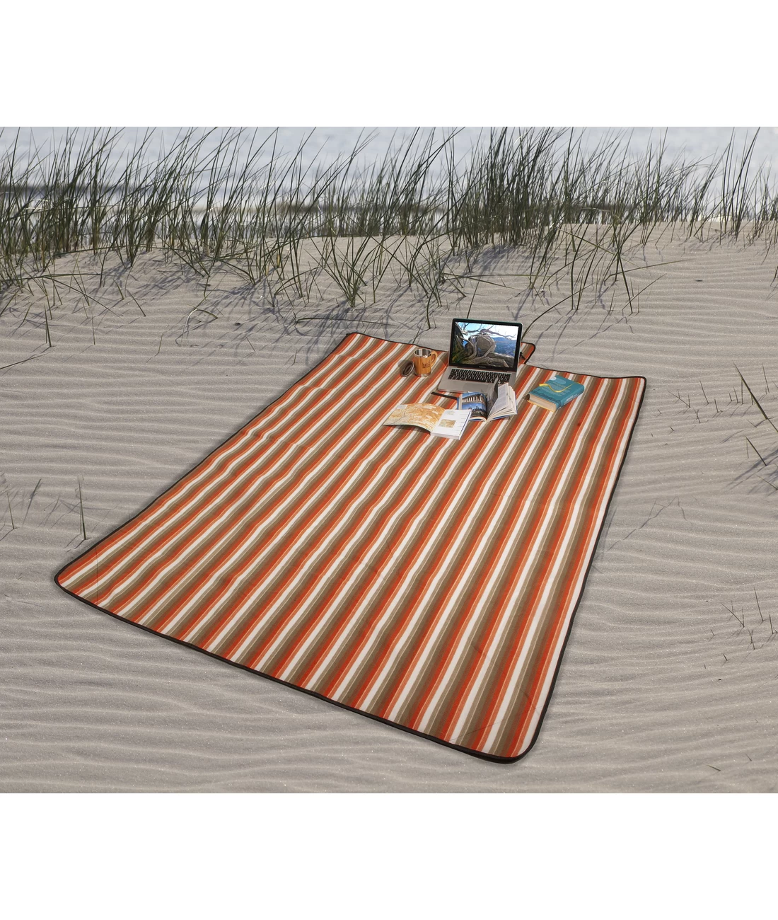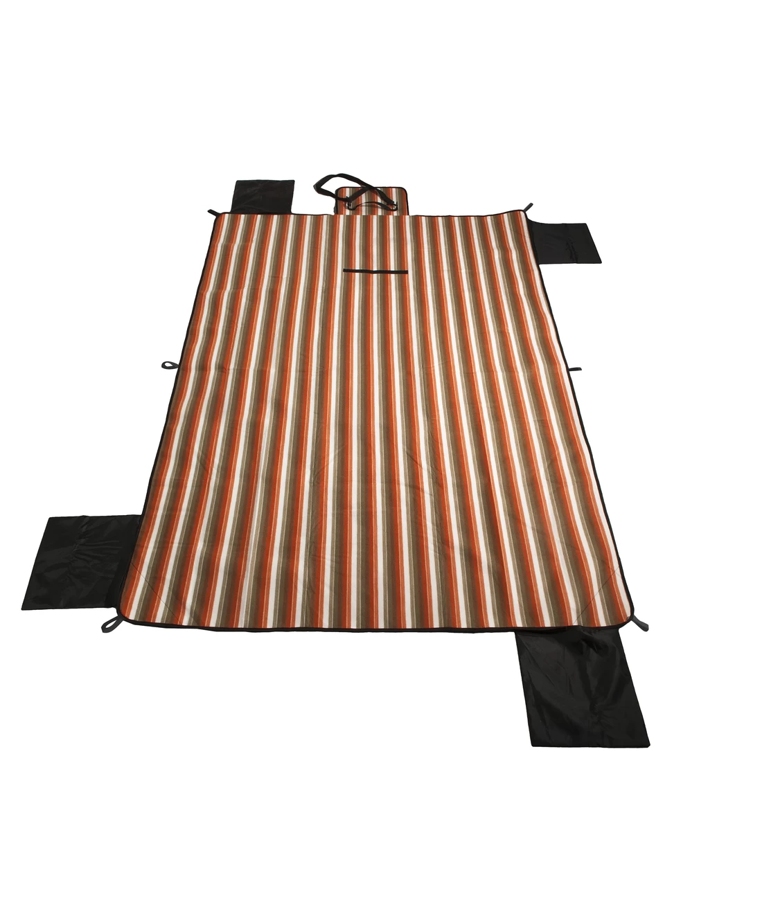 Universell einsetzbare Picknickdecke mit vielen praktischen Spezialdetails. Die Oberseite aus Fleece ist angenehm auf der Haut und strapazierfähig. Die Mittellage aus PU-Schaum isoliert und gibt der Decke eine gute Haptik. Die Unterseite aus EVA ist wasserfest und sehr stabil. Alle drei Lagen sind fest miteinander verbunden. Die Ecken sind verstärkt ausgeführt und mit jeweils einer offenen Tasche aus Nylon (30 x 30 cm) ausgestattet. Darin können Steine, Sand oder auch ein Buch die Decke beschweren und sicher am Platz halten. Die Taschen können aber auch einfach untergeschlagen werden oder für die Aufnahme von Zeitschriften oder Kleinmaterial dienen. An den Ecken und in der Mitte der langen Seiten findet man Schlaufen. Damit kann die Decke abgespannt (Heringe sind nicht enthalten) oder sogar notfalls auch als Tarp aufgespannt werden. Zusammengefaltet wird die Decke klein und praktisch mit dem verstellbaren Tragegurt und 2 Karabinern transportiert.