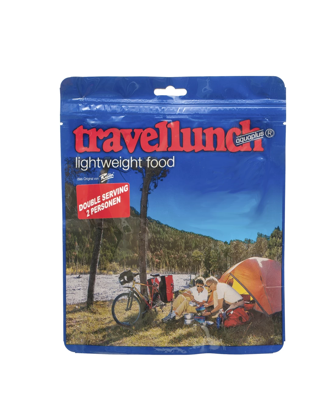 Travellunch Mahlzeiten sind aus guten, gefriergetrockneten und kontrollierten Zutaten hergestellt. Sie sind extrem leicht und unkompliziert zu transportieren, zwei Jahre ungekühlt haltbar und schnell zuzubereiten. 125 g reichen in etwa für eine Mahlzeit für eine Person, 250 g sind für den großen Hunger oder zwei Personen. Perfekt und bewährt für Reise, Camping, Expedition oder als Notreserve.