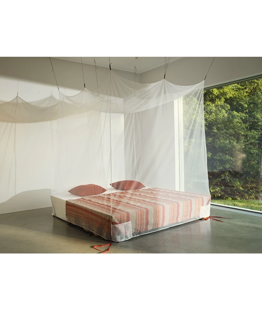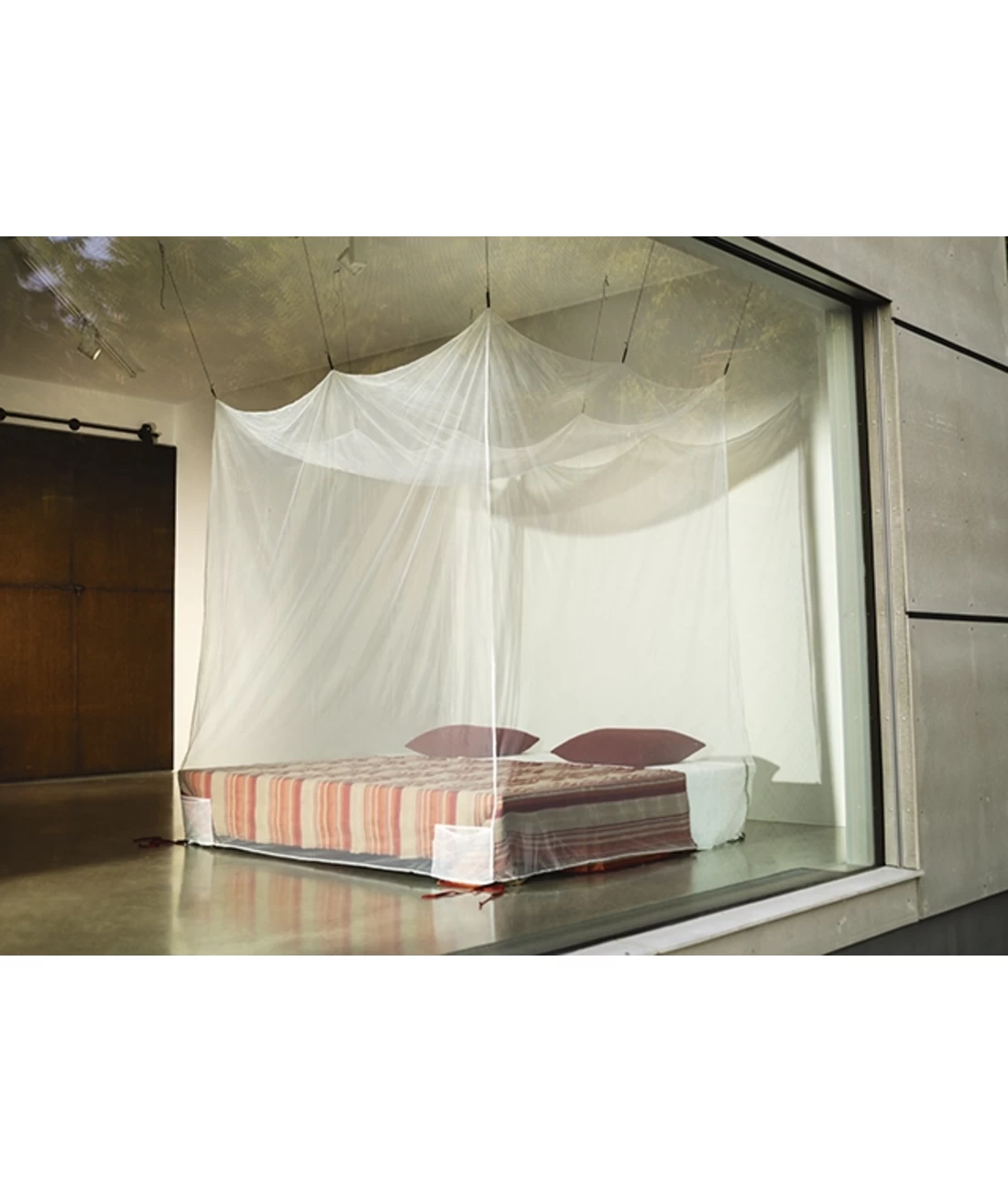 Das kastenförmige Box Mosquito Net Double bietet viel Bewegungsfreiheit im Netz und kommt mit Befestigungsschlaufen, einer 12 m langen, feinen Kordelschnur und Haken zum Aufhängen an der Decke. Das Moskitonetz ist für 2 Schlafplätze ausgelegt.
