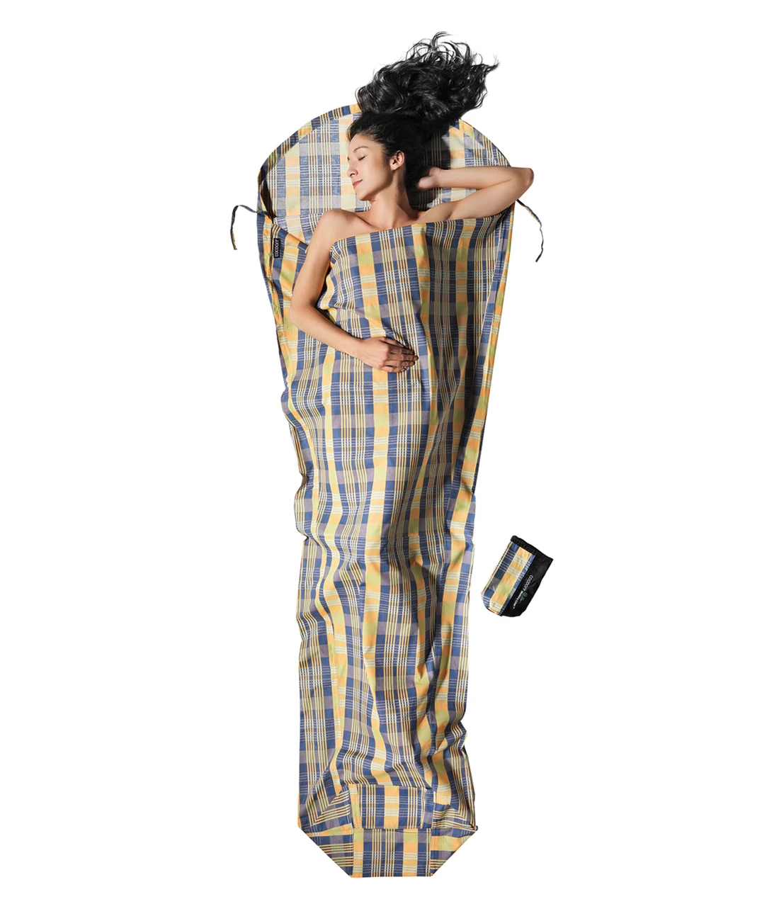 Extrem leichter, mumienförmiger Innenschlafsack zum Schutz des Schlafsackes vor Verschmutzung und zur Erhöhung seiner Wärmeleistung.