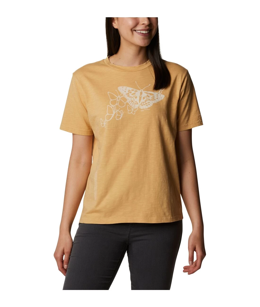 Ab jetzt haben Sie das ideale T-Shirt für entspannte Nachmittage und coole Wanderungen: dieses Baumwoll-Crewneck für Frauen von Columbia. Es ist nicht nur lässig, sondern auch unglaublich bequem. Dieses T-Shirt aus Bio-Baumwolle wurde hergestellt, um Ihnen ein Höchstmaß an weichem Komfort zu bieten. Mit einem großen Schmetterlingsdruck auf der Brust und einem kleinen Text über die Schönheit der Wildnis auf der Vorderseite unten.