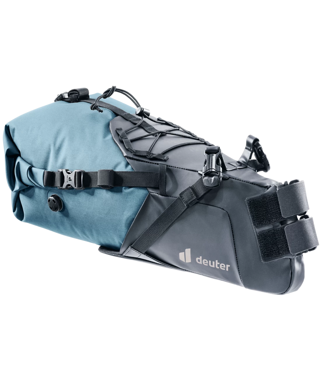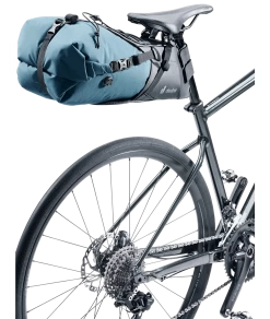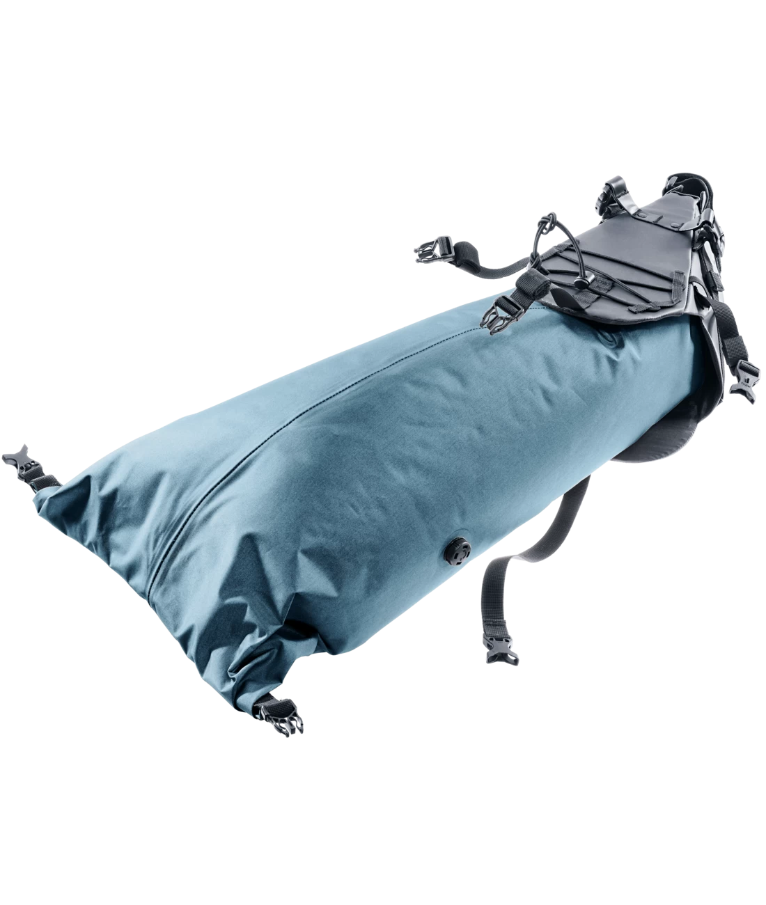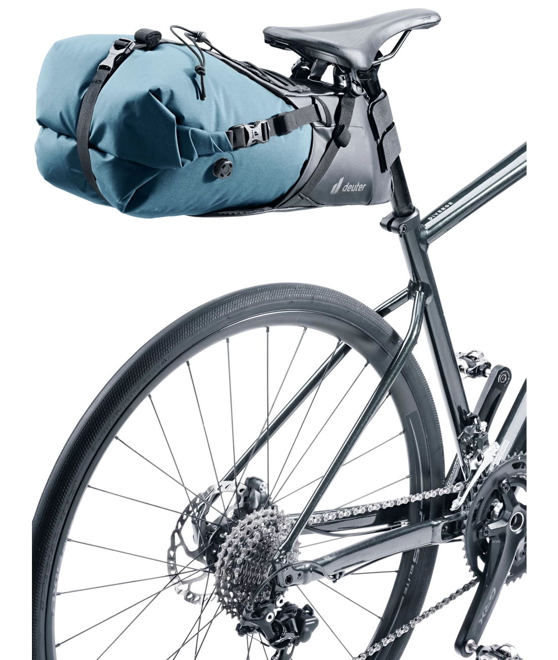 Leichte zweiteilige Satteltasche für echte Globetrotter aus leichtem, wasserdichtem Packsack mit beidseitigem Roll-Top und Komprimierungsventil sowie Lenkertasche aus strapazierfähigem Material mit elastischem Kompressionszug und Materialschlaufen auf der Oberseite, ermöglicht schnelles Be- und Entladen bei spontanen Zwischenstopps, da die Taschenhalterungen am Fahrrad belassen, während der Packsack mitgenommen werden kann. Die robusten Gurtbänder können dank Klettverschluss zur Verdrehsicherung und mitgelieferter Distanzstücke an unterschiedlichste Rohrdurchmesser angepasst werden und sind auch für Carbon-Fahrräder geeignet.