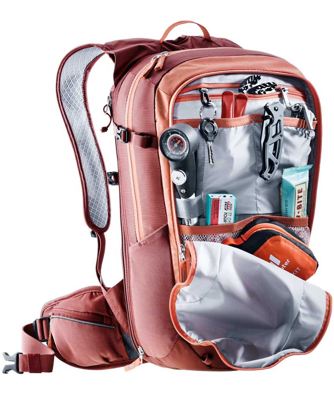 Der Compact ist ein Bike-Rucksack für Mountainbiker, der bequem und fest auf dem Rücken sitzt. Er besticht vor allem mit seiner perfekten Ausstattung: Er hat ein extra Fach für die Trinkblase, ein separates Fach für das Smartphone, ein übersichtliches Werkzeugfach, zwei Reißverschluss-Taschen auf den Hüftflossen und zwei elastische Seitentaschen. Außerdem besteht die Möglichkeit das Volumen des Rucksacks zu erweitern. Der Halbschalenhelm kann ganz einfach vorne in die Befestigungs-Clips gehangen werden, während sich die seitlichen Kompressionsriemen zur Fixierung des Fullface-Helms eignen.