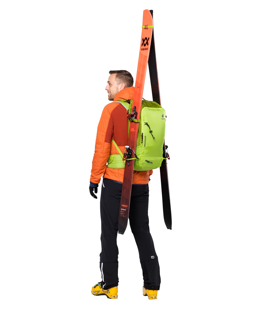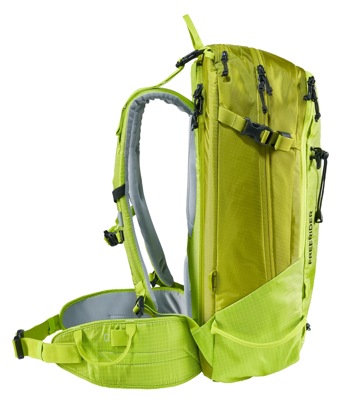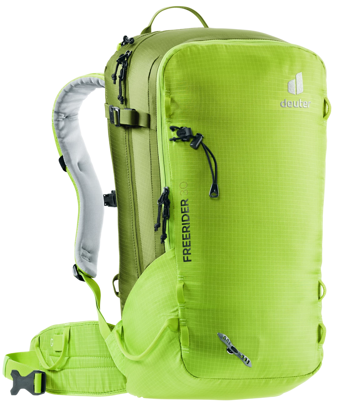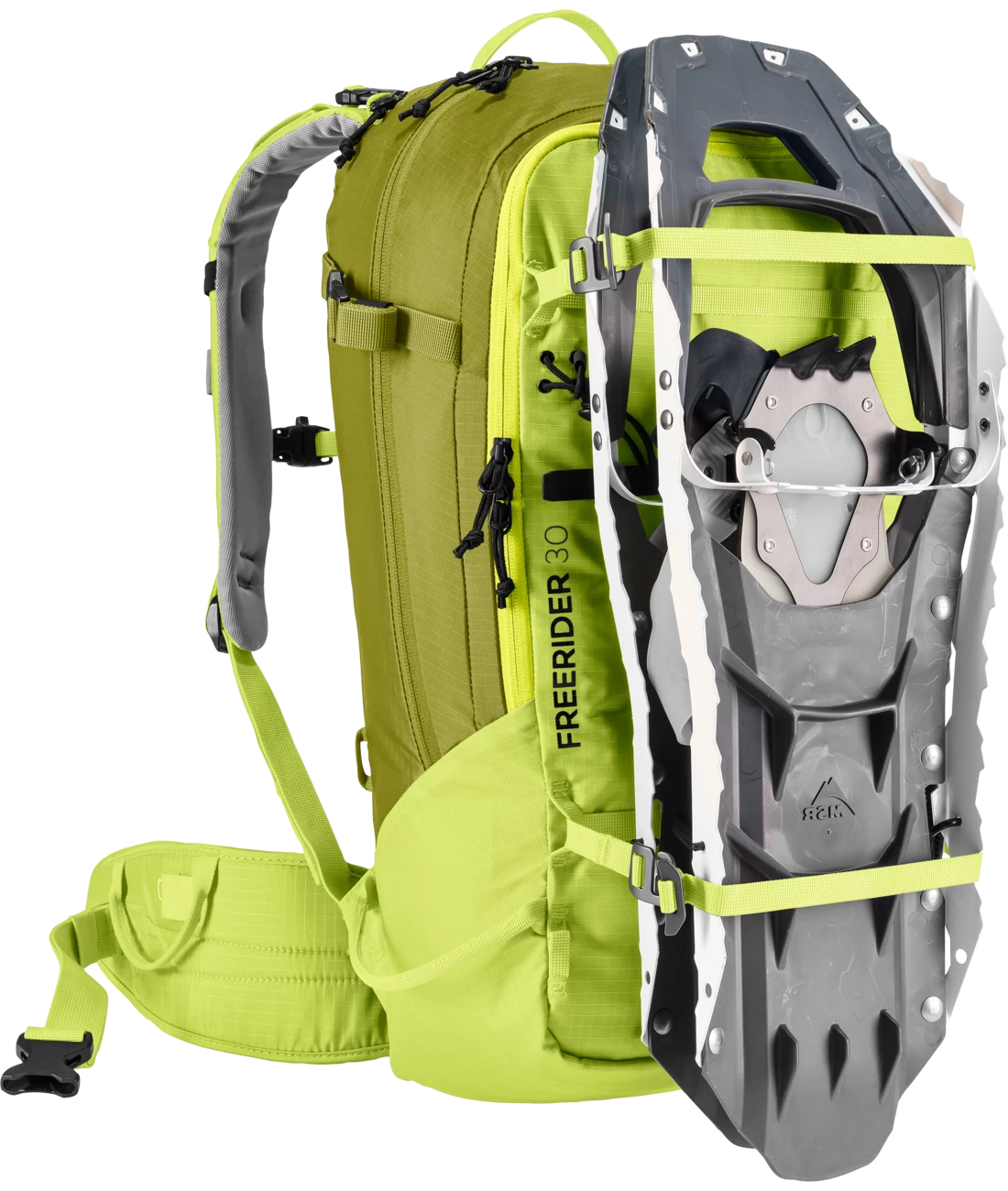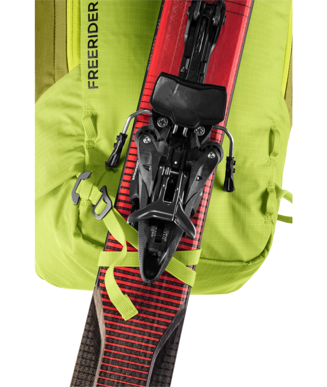 Der Freerider besticht mit seiner durchdachten Winter-Ausstattung, zum Beispiel mit der komplett aufklappbaren Rückenöffnung. Zum einen bietet er so einen optimalen Überblick über die Ausrüstung. Zum anderen bleibt das Rückensystem beim Ablegen des Rucksacks trocken. Sollte trotzdem etwas Schnee an das Tragesystem gelangen, sorgt das neue robuste, atmungsaktive und schneeabweisende Material für einen trockenen Rücken. Auch das Thema Sicherheit wird beim Freerider großgeschrieben. Mit dem separaten und schnell zugänglichen Sicherheitsfach für Sonde und Schaufel hält der Touren-Rucksack das Wichtigste im Notfall griffbereit. Neu ist auch das variable Fixierungssystem. Mit zwei separaten Riemen können Skier, Snowboard und Schneeschuhe im Handumdrehen außen am Rucksack befestigt werden: Skier diagonal oder in A-Form, Snowboard und Schneeschuhe vertikal. Außerdem dienen die flexibel einsetzbaren Befestigungsriemen zur seitlichen Kompression.