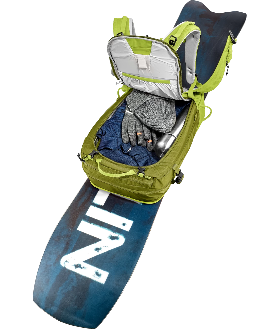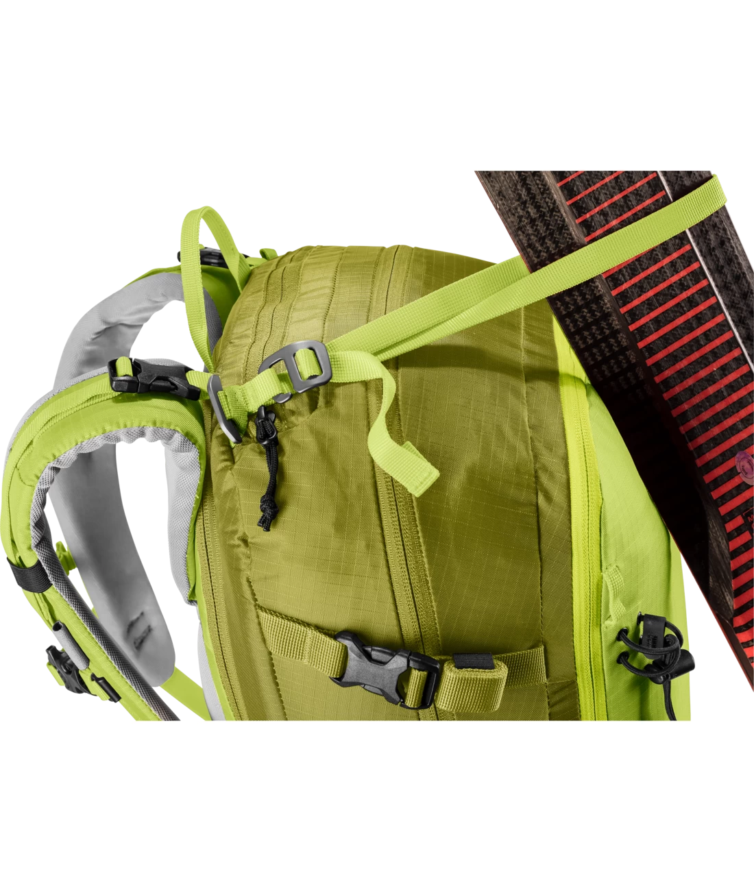 - Zwei separate, verstaubare Befestigungsriemen um Ski (diagonal oder A-Frame), Snowboard oder Schneeschuhe zu fixieren oder den Rucksack zu komprimieren + seitliche Skihalterung