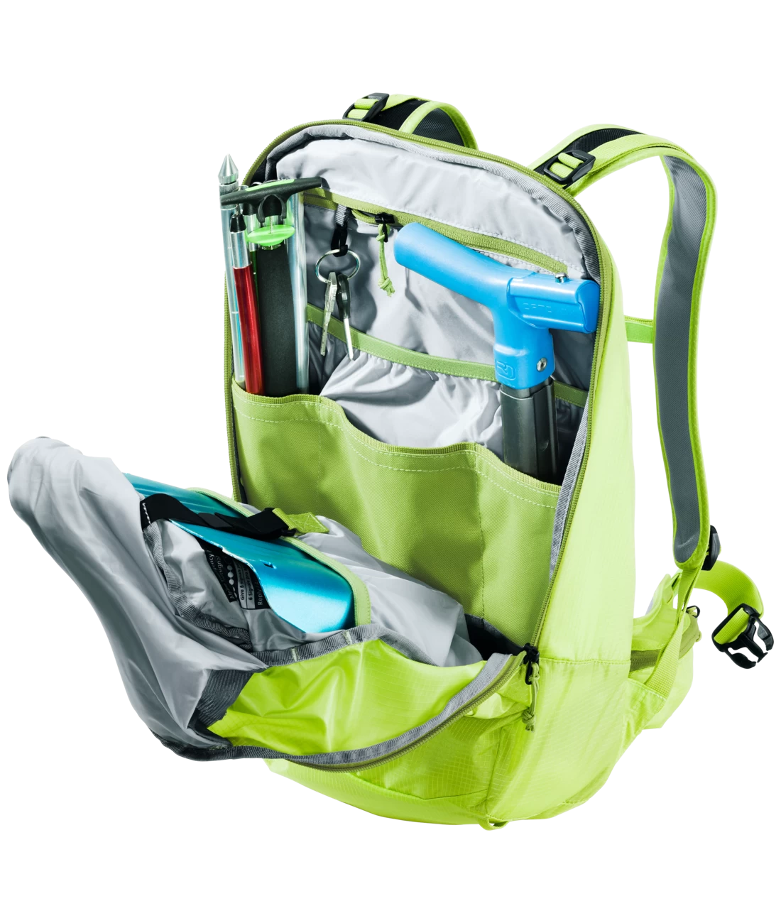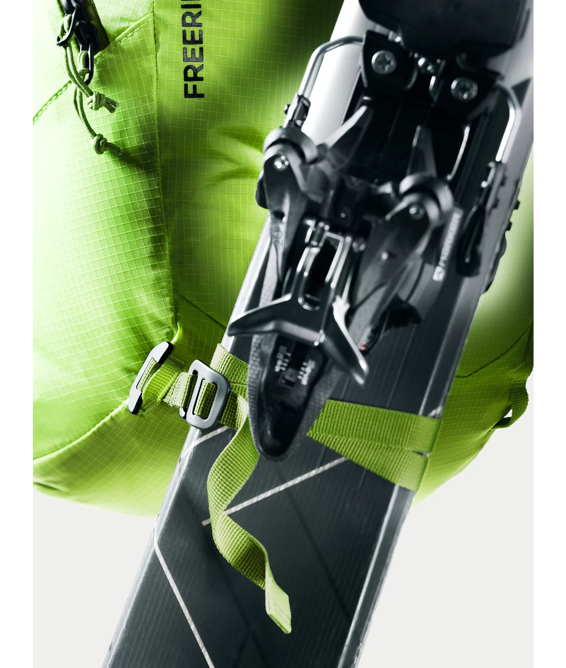 - Zwei separate, verstaubare Befestigungsriemen um Ski (diagonal), Snowboard oder Schneeschuhe zu fixieren