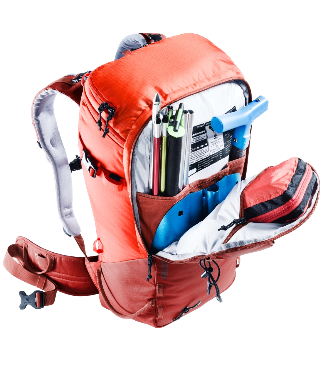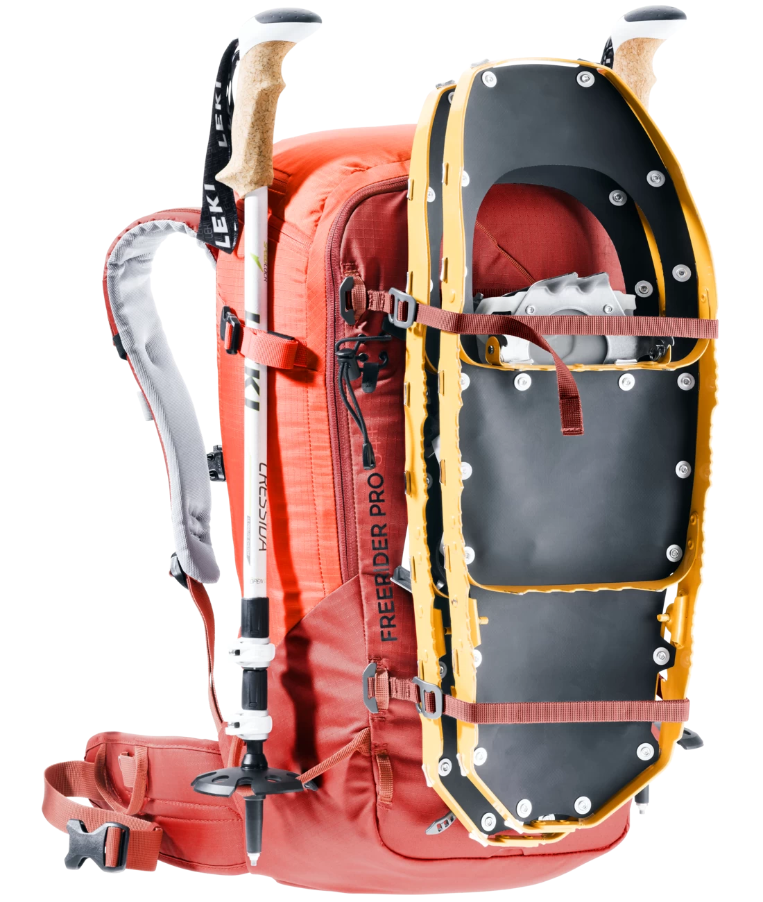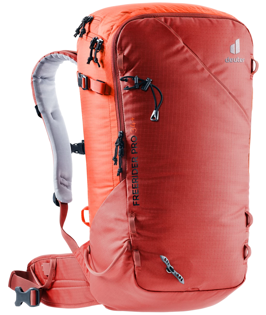 Der Freerider Pro ist mit seiner vielseitigen Ausstattung genau richtig für Mehrtagestouren in verschneiten Bergen. Ein Highlight des Freerider Pro ist das neue Rolltop. Denn damit können Sie das Volumen um ca. 10 Liter erweitern. Außerdem befindet sich an dem Rolltop ein verstaubarer Riemen, mit dem man zusätzliches Gepäck oder ein Seil fixieren oder das Rolltop selbst komprimieren kann. Wenn Sie ihre Skier, Schneeschuhe oder das Snowboard in bestimmten Passagen nicht benötigen, können Sie sie ganz einfach und sicher außen am Rucksack – mit den extra dafür vorgesehenen Befestigungsriemen – fixieren. Skier lassen sich diagonal oder in A-Form, Snowboard und Schneeschuhe vertikal befestigen. Außerdem dienen die flexibel einsetzbaren Riemen zur seitlichen Kompression.