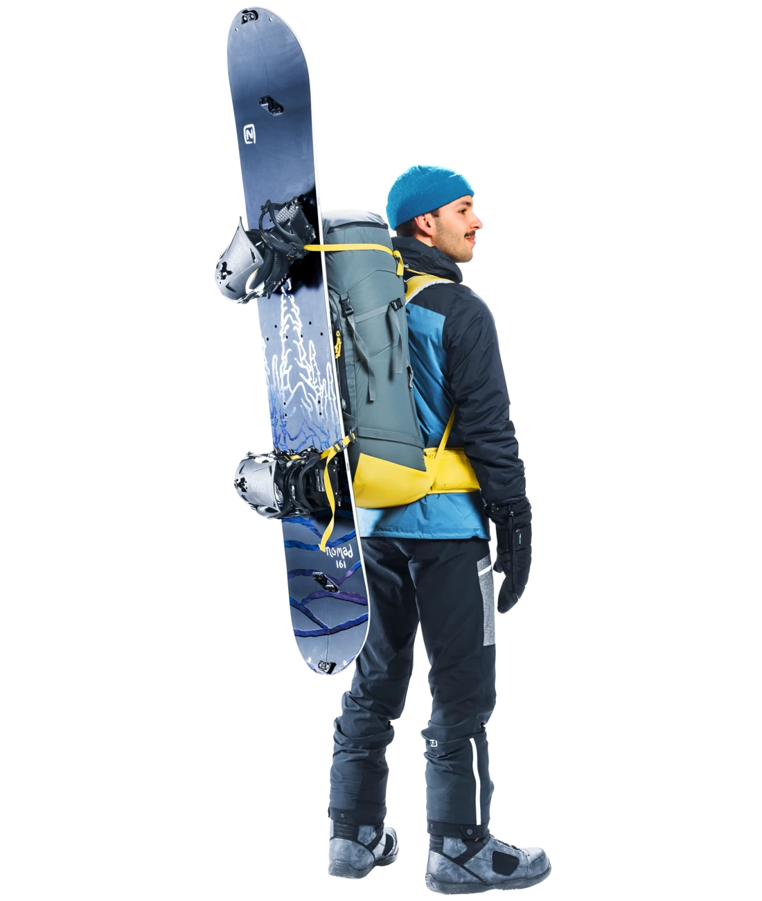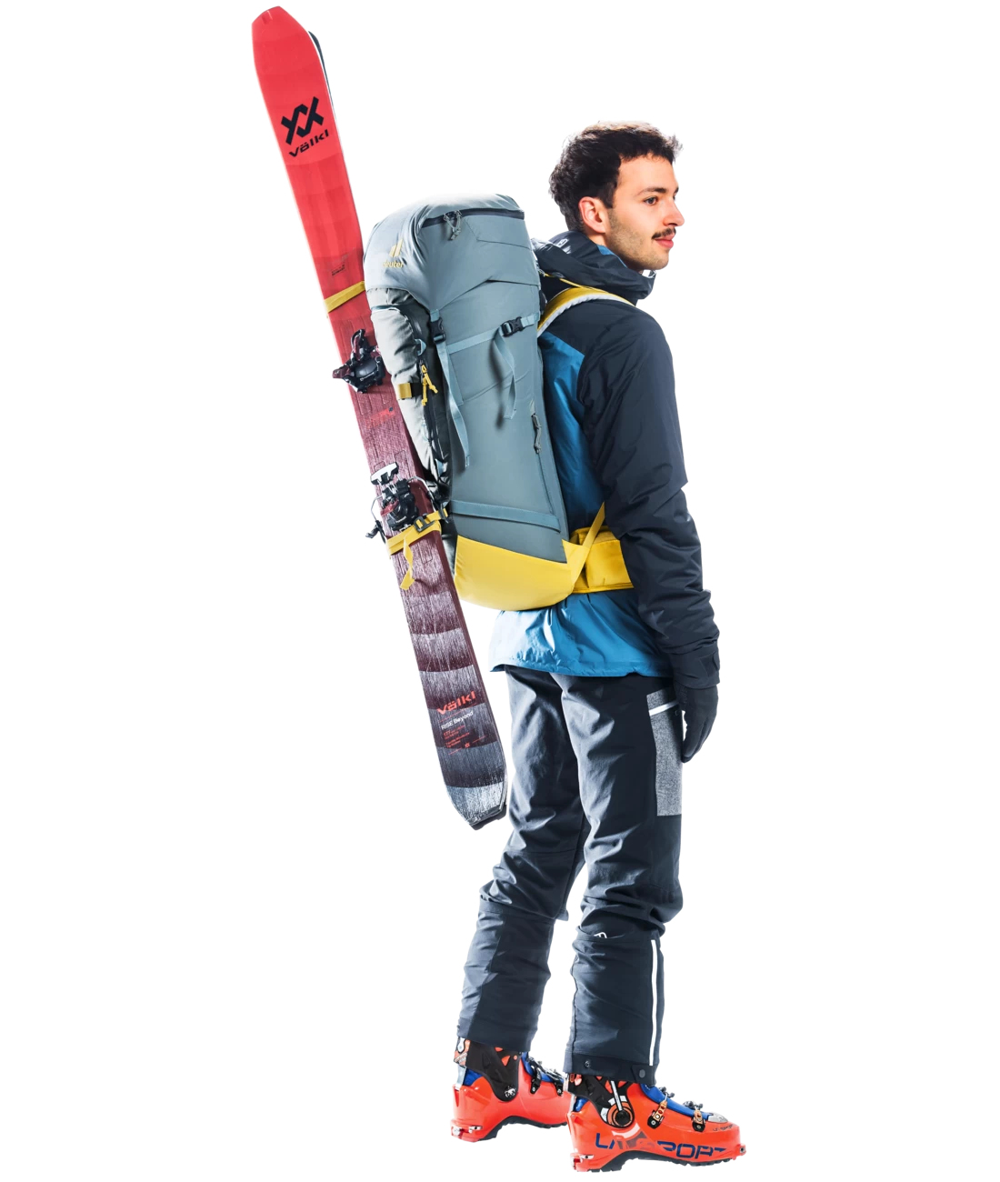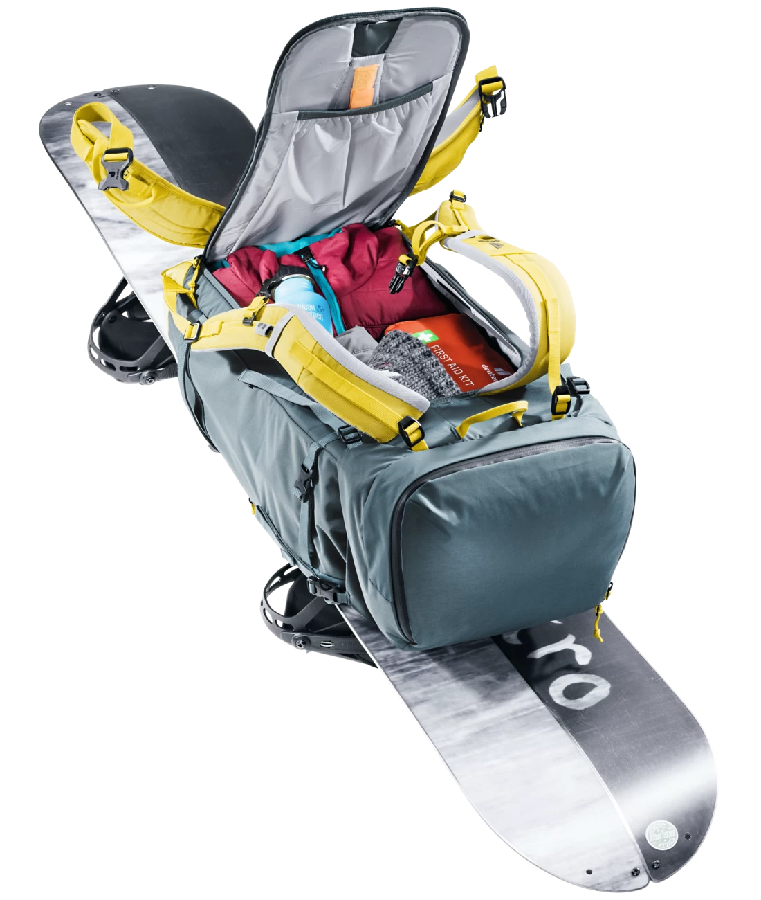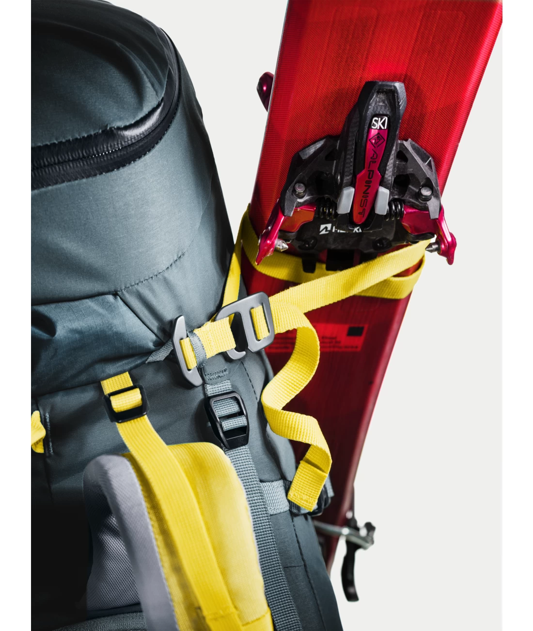 - zwei separate, verstaubare Befestigungsriemen um Ski (diagonal oder A-Frame), Snowboard und Steigeisen zu fixieren + verstärkte seitliche Skihalterung
