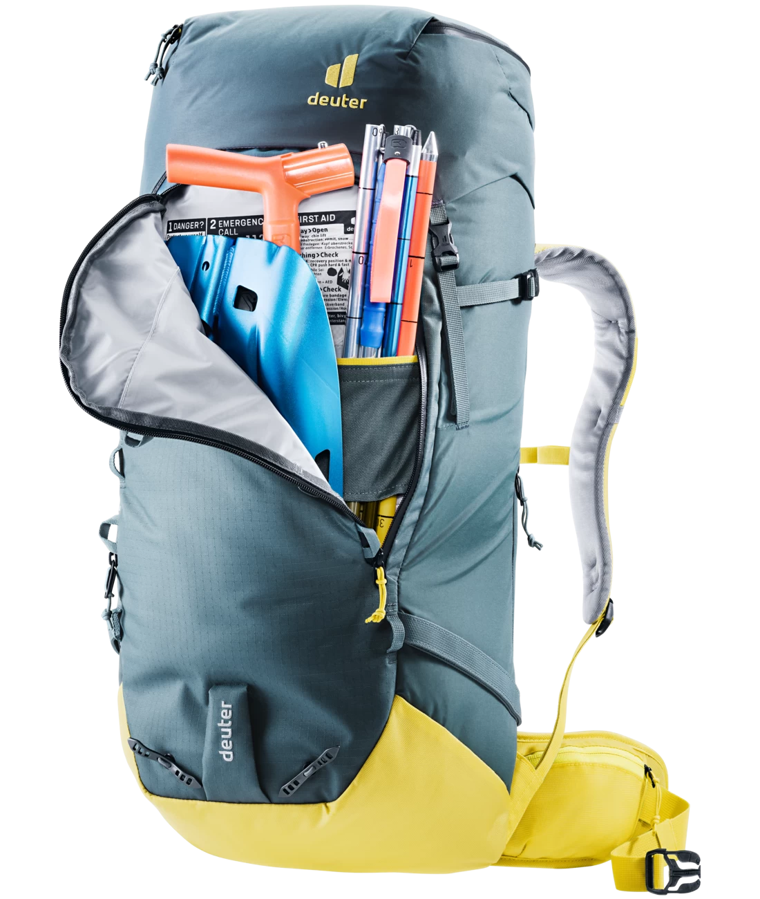 - Zwei Pickel-/Eisgerätehalterungen (obere Klett-Schlaufen abnehmbar)