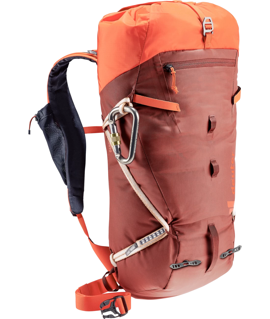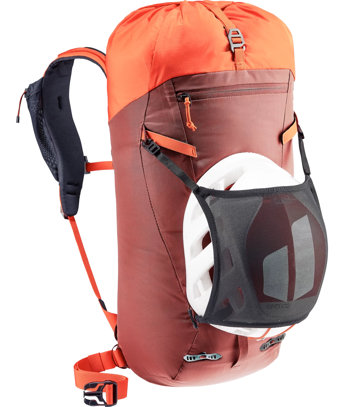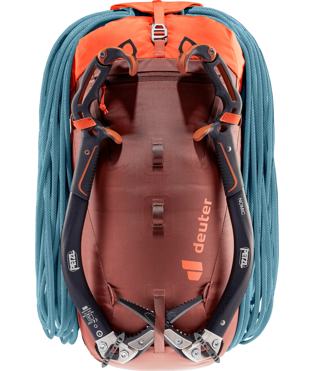 Der klimaneutrale, PFC-freie Guide überzeugt durch niedriges Gewicht und zuverlässiges Handling. Robuste Materialien, hochwertige Verarbeitung, ausgefeilte Befestigungsmöglichkeiten für Pickel und Helm sowie die verstaubare Seilfixierung machen den Rucksack zum Klassiker für anspruchsvolle alpine Unternehmungen. Die Deckelkonstruktion erlaubt einen schnellen Zugriff auf das Hauptfach. Mit dem im Deckel integrierten, abnehmbaren Netz lässt sich der Helm je nach Bedarf entweder oben am Deckel oder an der Rucksackfront befestigen.