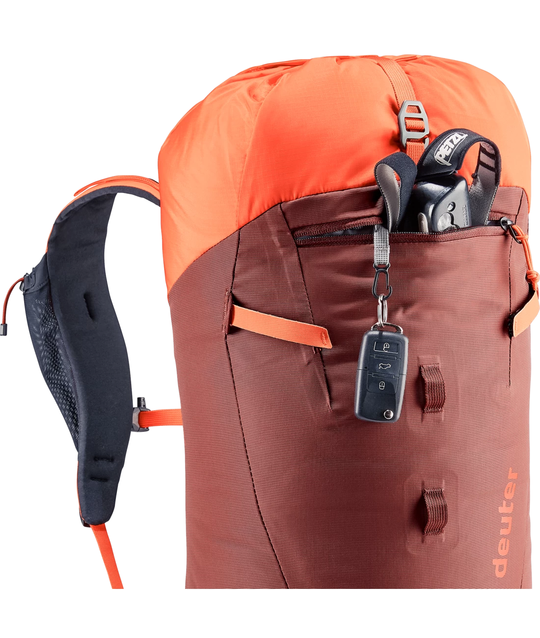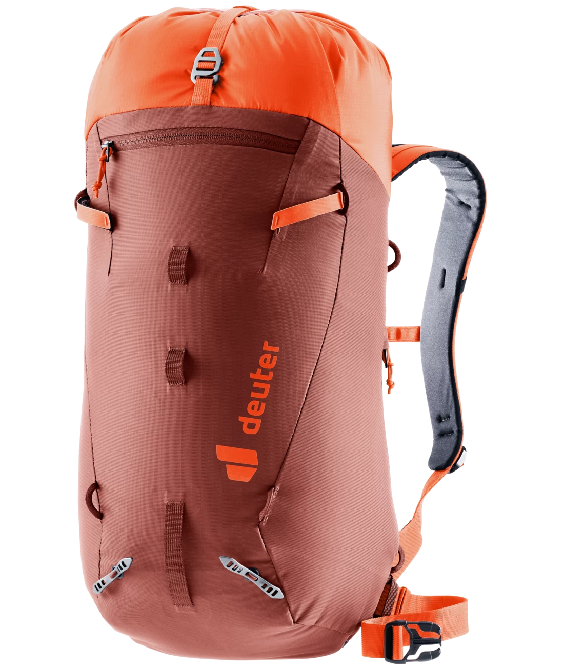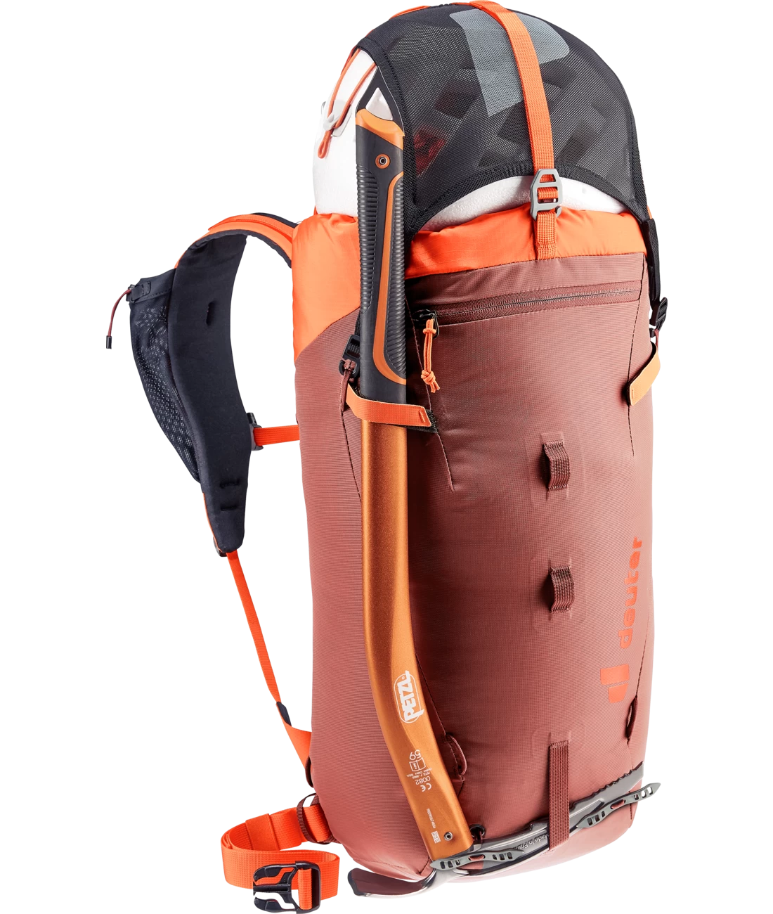 Der klimaneutrale, PFC-freie Guide überzeugt durch niedriges Gewicht und zuverlässiges Handling. Robuste Materialien, hochwertige Verarbeitung, ausgefeilte Befestigungsmöglichkeiten für Pickel und Helm sowie die verstaubare Seilfixierung machen den Rucksack zum Klassiker für anspruchsvolle alpine Unternehmungen. Die Deckelkonstruktion erlaubt einen schnellen Zugriff auf das Hauptfach. Mit dem im Deckel integrierten, abnehmbaren Netz lässt sich der Helm je nach Bedarf entweder oben am Deckel oder an der Rucksackfront befestigen.