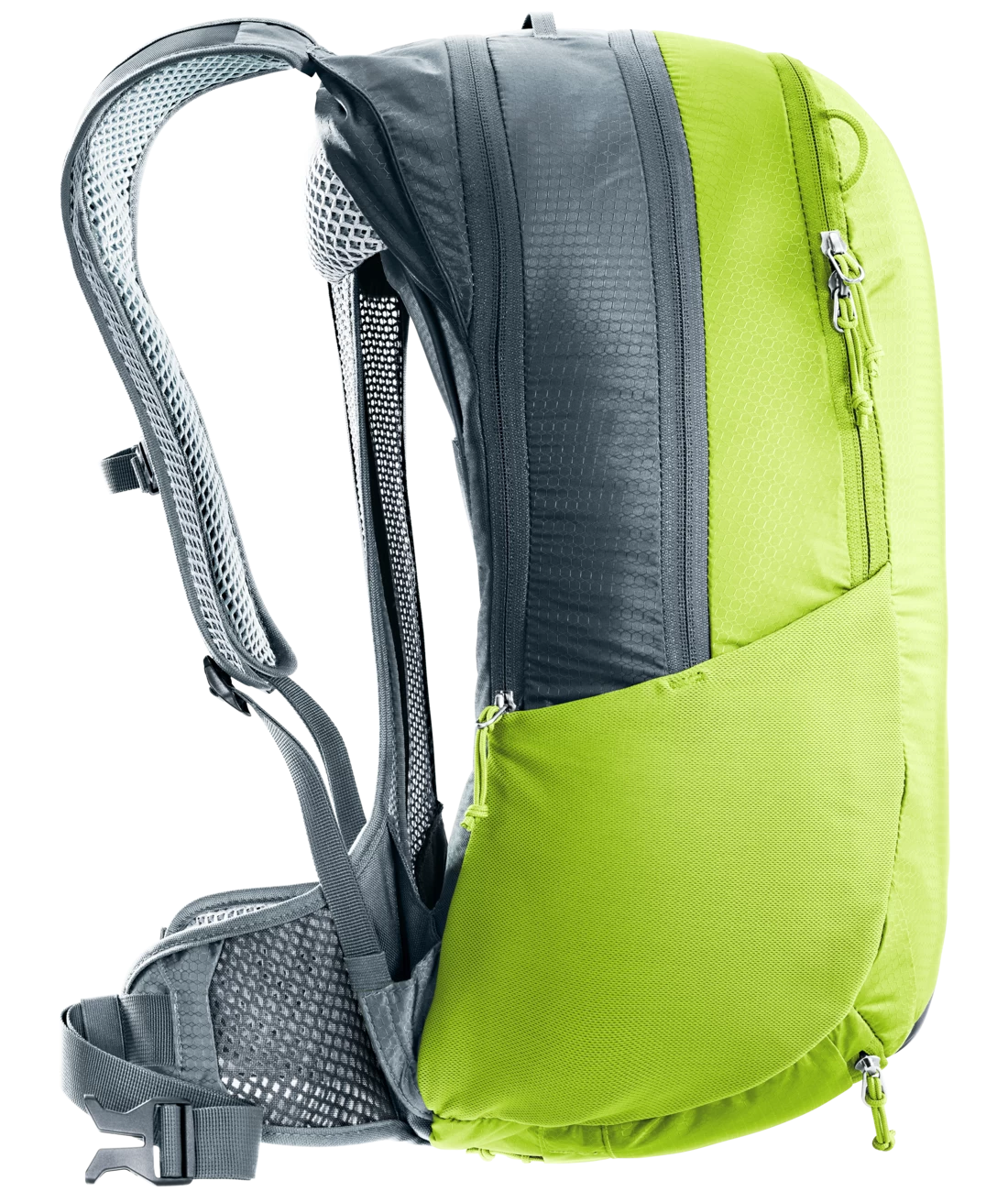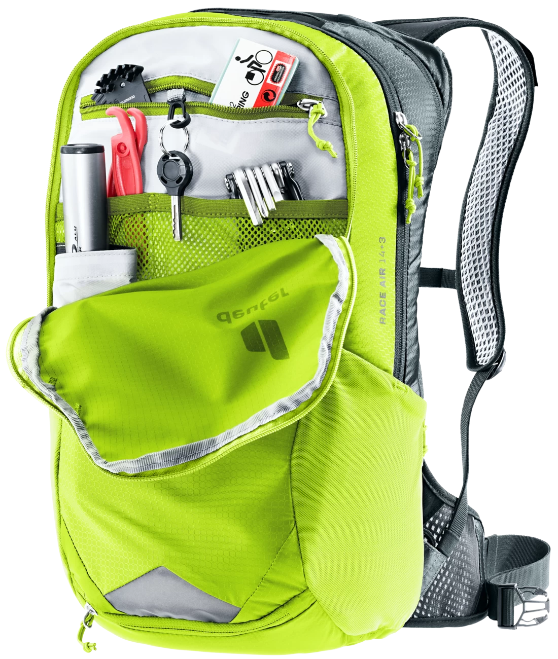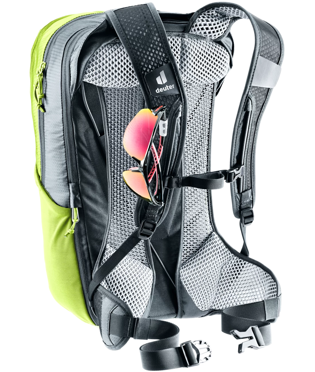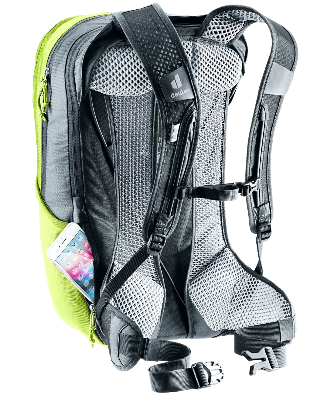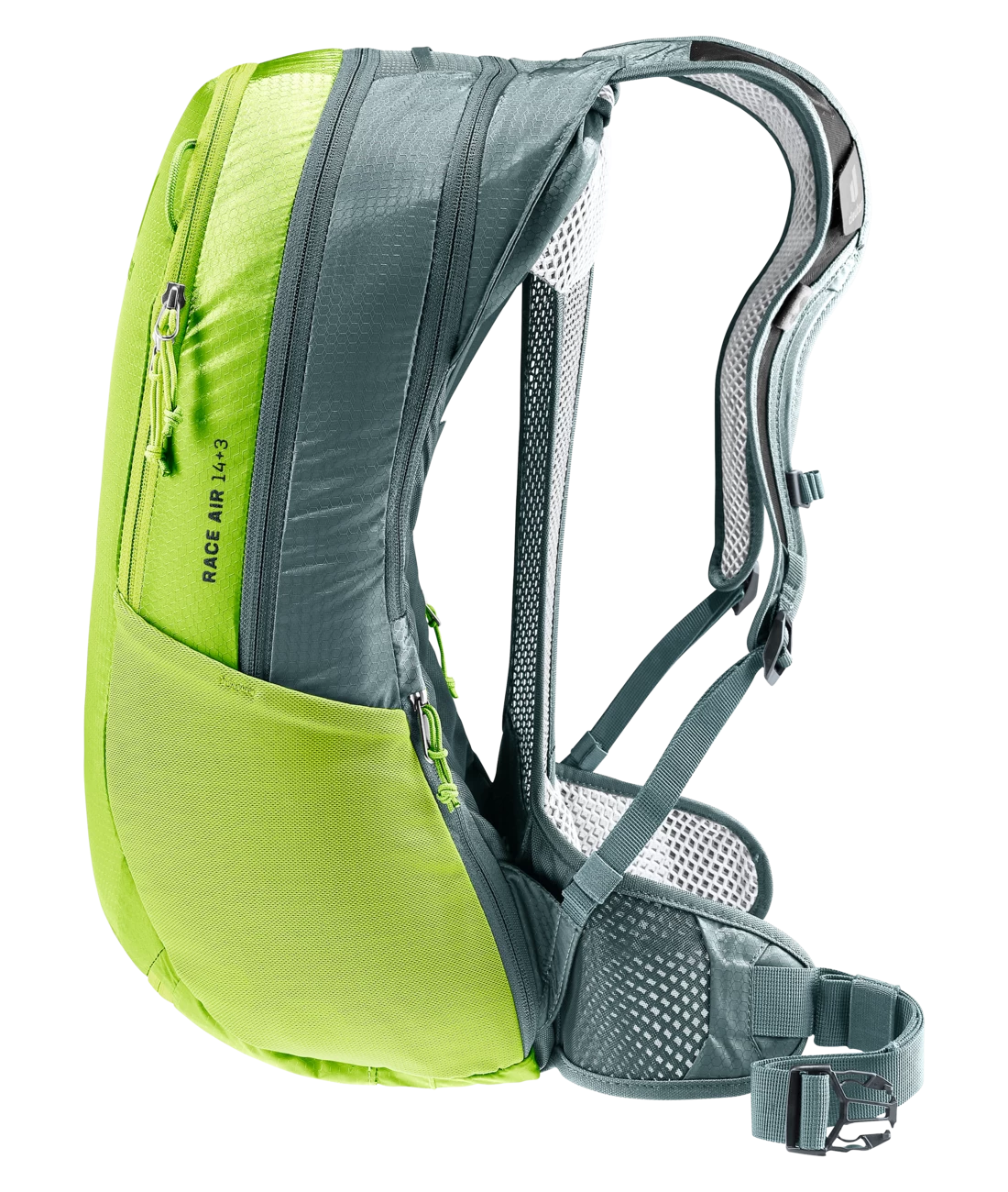 Extrem leichter, stabiler Bike-Rucksack mit hervorragender Gewicht-Komfort-Ratio. Das bikespezifische Aircomfort Rückensystem mit mittig geteiltem Netzrücken reduziert die Auflagefläche und verschafft der, in Fahrhaltung gekrümmten Wirbelsäule mehr Platz. Netzhüftflossen, perforierte Schulterträger und Rückenpolster sorgen für maximale Belüftung und kompakten Sitz. Der klimaneutrale, PFC-freie Rucksack für sportliche Mountainbiker*innen ist aus bluesign(R) zertifiziertem Hauptmaterial aus 100 % recycelten Stoffen und 100 % umweltfreundlich hergestellten, ressourcenschonenden Bestandteilen. Beim Deuter Race Air 14+3 können Sie das Volumen um zusätzliche 3 Liter erweitern – für den Fall der Fälle.