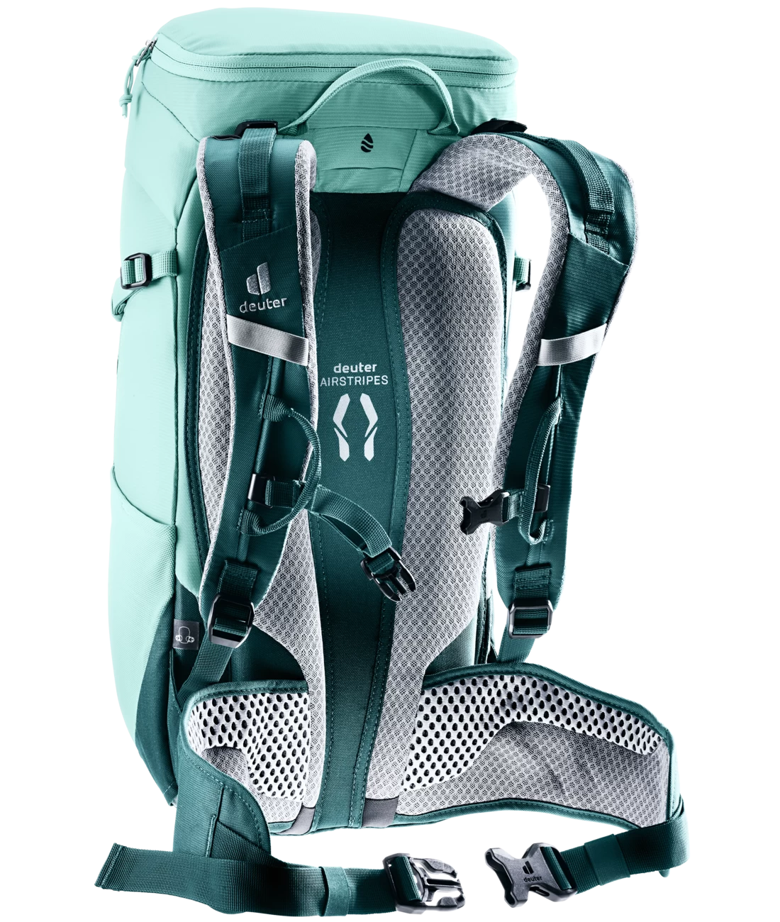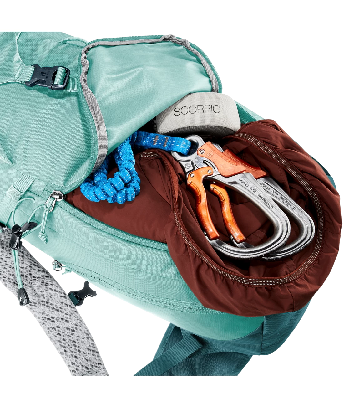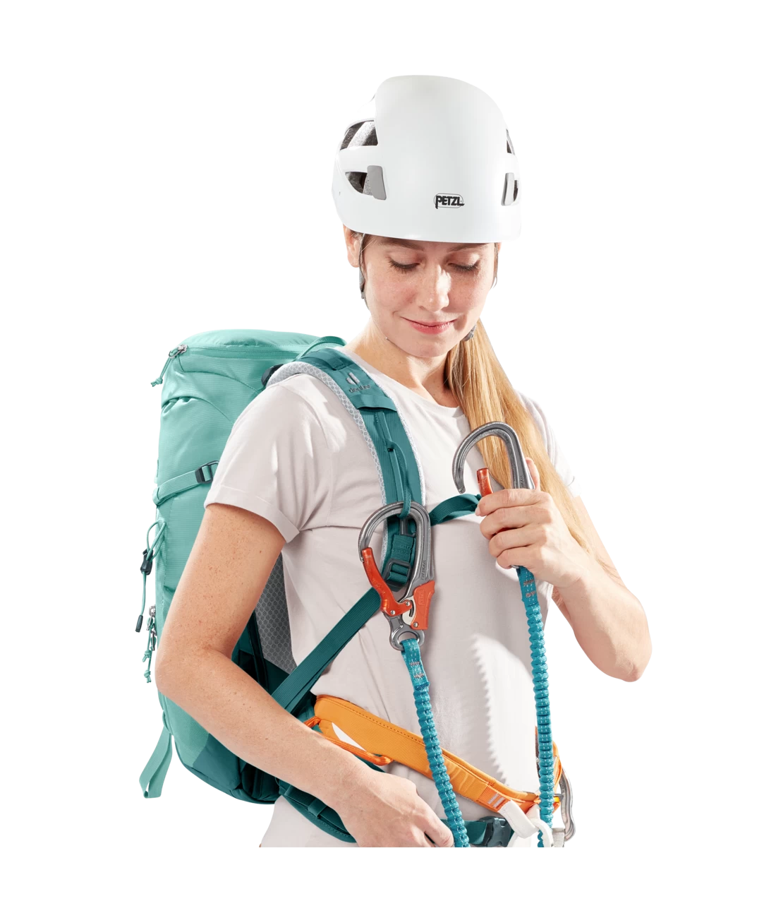 Das Airstripes Rückensystem mit geringer Rückenauflage und großen Belüftungskanälen sowie die perforierten Schulterträger und Hüftflossen sorgen für optimale Luftzirkulation, eine körpernahe Gewichtsverteilung und damit einen kompakten Sitz in jedem Terrain. Die flache Deckelkonstruktion bietet gute Kopffreiheit – auch mit Helm. Dank Fixierungen an den Schulterträgern sind die Karabiner des Klettersteigsets stets griffbereit. Zudem sind Ausrüstungsgegenstände und Material dank großem Reißverschluss-Frontzugang und Seitentaschen schnell zur Hand.