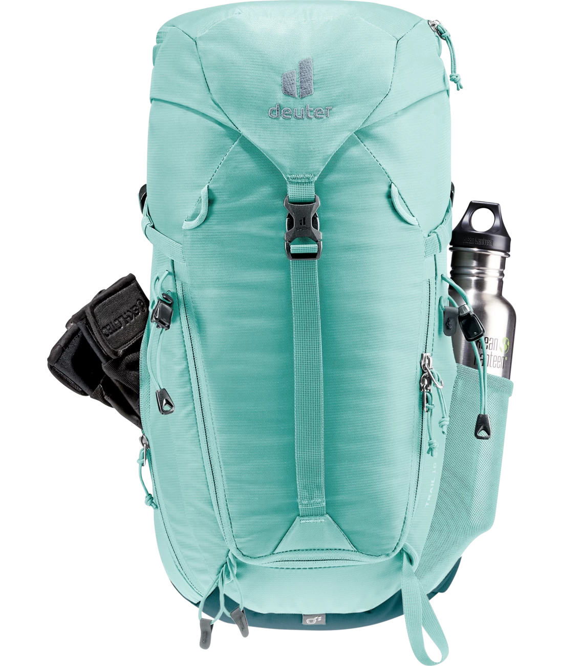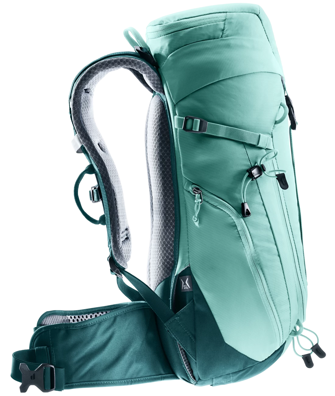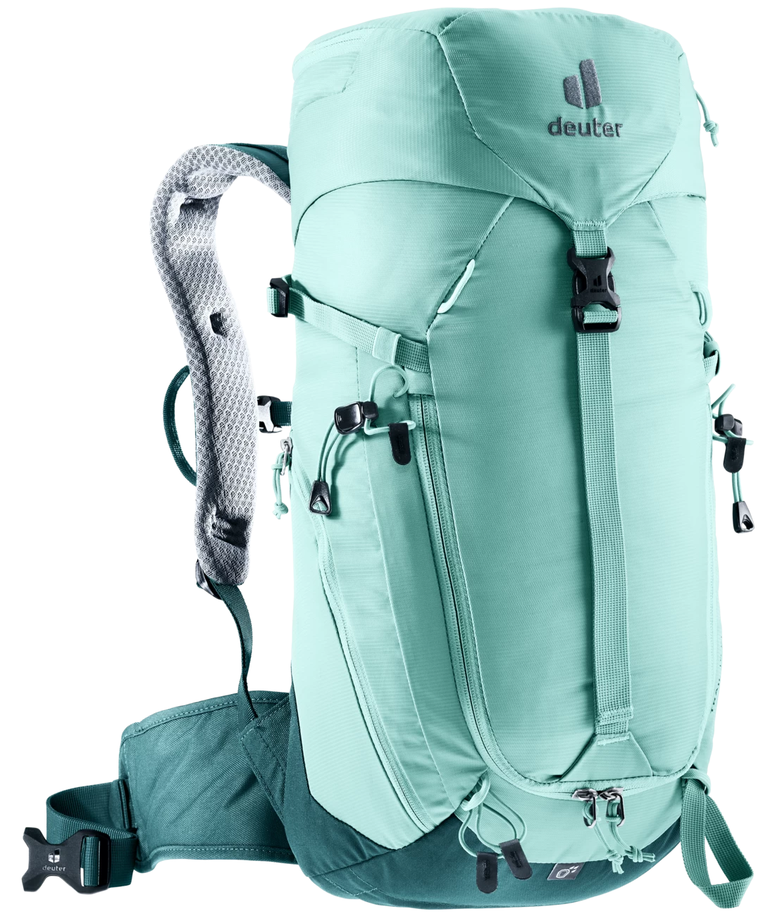 Das Airstripes Rückensystem mit geringer Rückenauflage und großen Belüftungskanälen sowie die perforierten Schulterträger und Hüftflossen sorgen für optimale Luftzirkulation, eine körpernahe Gewichtsverteilung und damit einen kompakten Sitz in jedem Terrain. Die flache Deckelkonstruktion bietet gute Kopffreiheit – auch mit Helm. Dank Fixierungen an den Schulterträgern sind die Karabiner des Klettersteigsets stets griffbereit. Zudem sind Ausrüstungsgegenstände und Material dank großem Reißverschluss-Frontzugang und Seitentaschen schnell zur Hand.