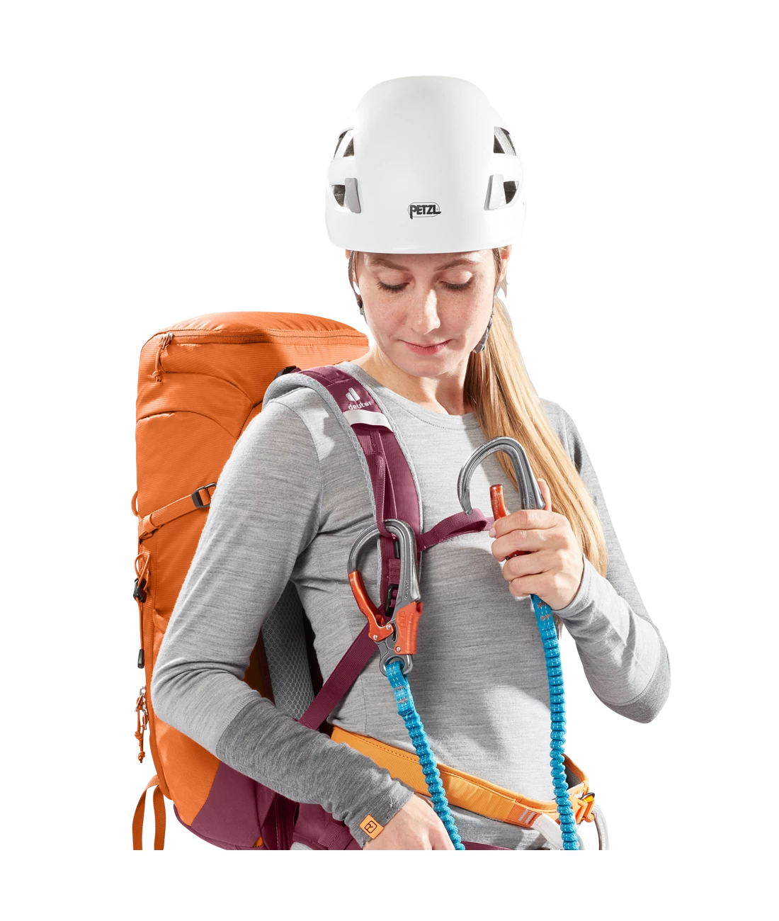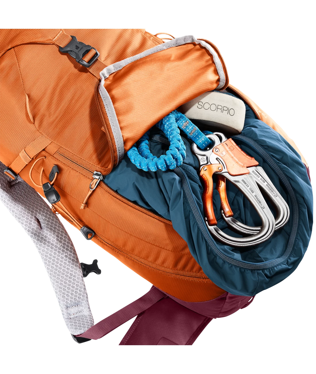 Das Airstripes Rückensystem mit geringer Rückenauflage und großen Belüftungskanälen sowie die perforierten Schulterträger und Hüftflossen sorgen für optimale Luftzirkulation, eine körpernahe Gewichtsverteilung und damit einen kompakten Sitz in jedem Terrain. Die flache Deckelkonstruktion bietet gute Kopffreiheit – auch mit Helm. Dank Fixierungen an den Schulterträgern sind die Karabiner des Klettersteigsets stets griffbereit. Zudem sind Ausrüstungsgegenstände und Material dank großem Reißverschluss-Frontzugang und Seitentaschen schnell zur Hand.