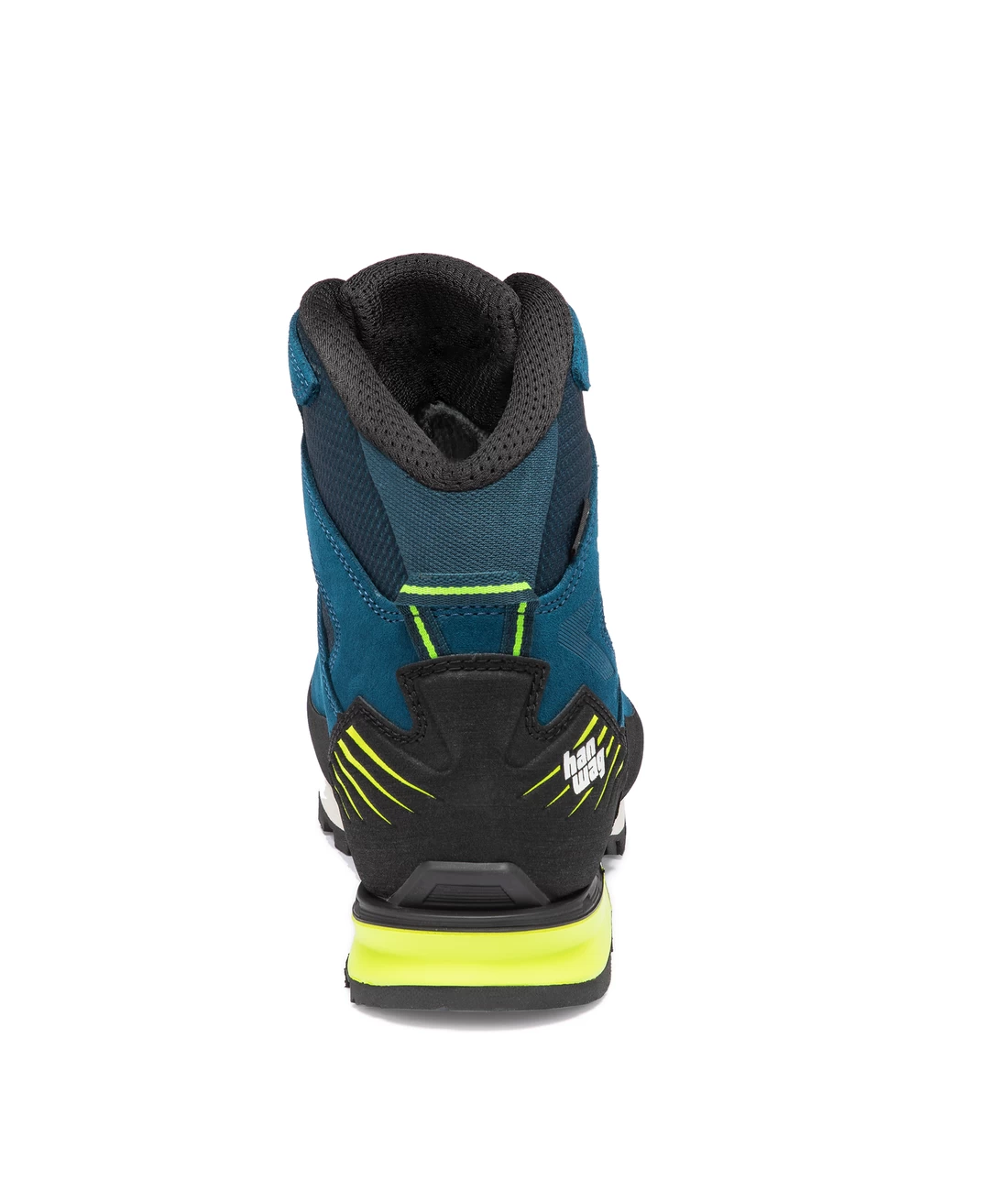 Der Makra Pro GTX eignet sich für anspruchsvolle Bergtouren mit Gletscherpassagen genauso wie für einfachere Hoch- und Felstouren im Sommer. Der leichte und stabile Allrounder ist mit wasserdichter GORE-TEX Membran und langlebigem Perwanger Oberleder ausgestattet. Für die leichte, jedoch besonders stabile Zwischensohle kommt eine Kombination aus PU, TPU und EVA zum Einsatz. PU in der Ferse – mit integrierter Stegeisenauflage aus TPU – sorgt für perfekte Dämpfung, EVA im Vorfußbereich für Präzision im Antritt. Exzellenten Grip bietet die Vibram® Makra Laufsohle. Ein Dream-Team! „Hanwag 2 Zone Lock“ mit einer mechanischen Klemme sorgt für einen verbesserten Fersenhalt. Im Gegensatz zu einem herkömmlichen Klemmhaken blockiert die mechanische Klemme zuverlässig und kann nach dem Fixieren nicht mehr – ohne manuelles Zutun – verrutschen. Ein Merkmal der Makra Familie ist die optimierte Ghilly-Schnürung bis in den Zehenbereich – dabei werden die Schnürsenkel durch Textilschlaufen gezogen. Der Fuß hat so auch im vorderen Bereich und man steht stabil im Schuh. Der Alpine Wide-Leisten bietet einen etwas breiteren Vorfußbereich für mehr Komfort – wodurch der Schuh jedoch nicht an Kletterperformance und Präzision im Antritt verliert.