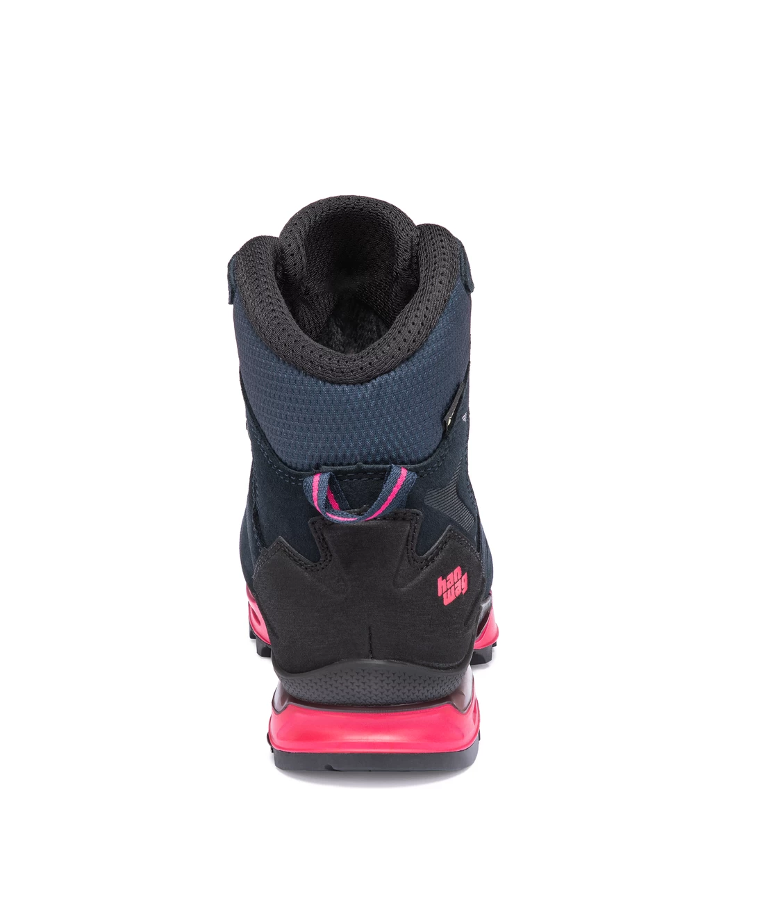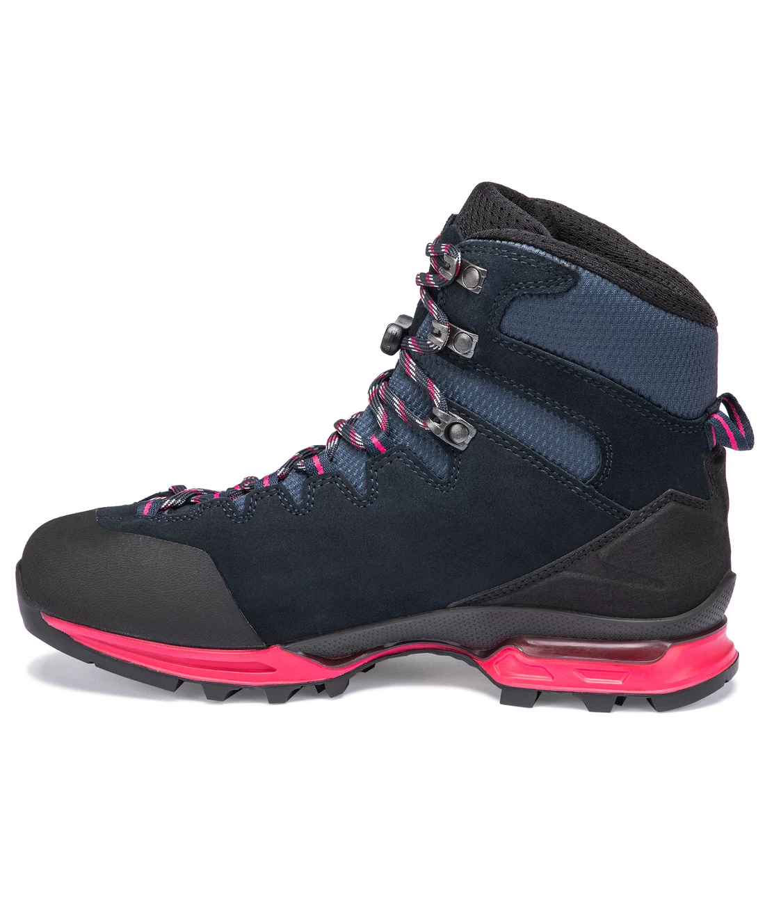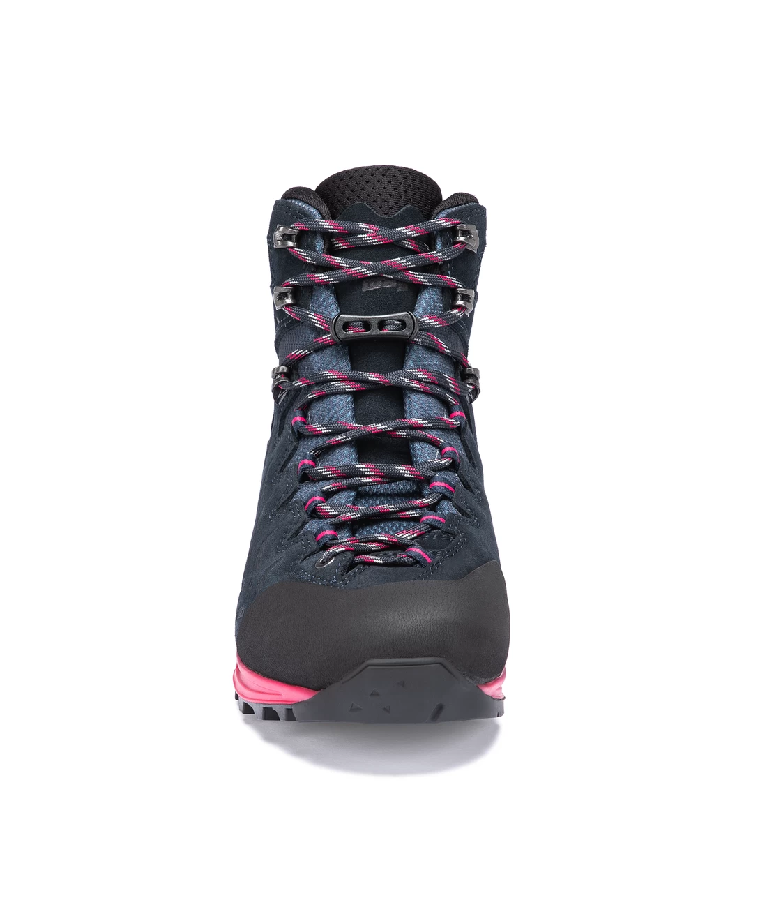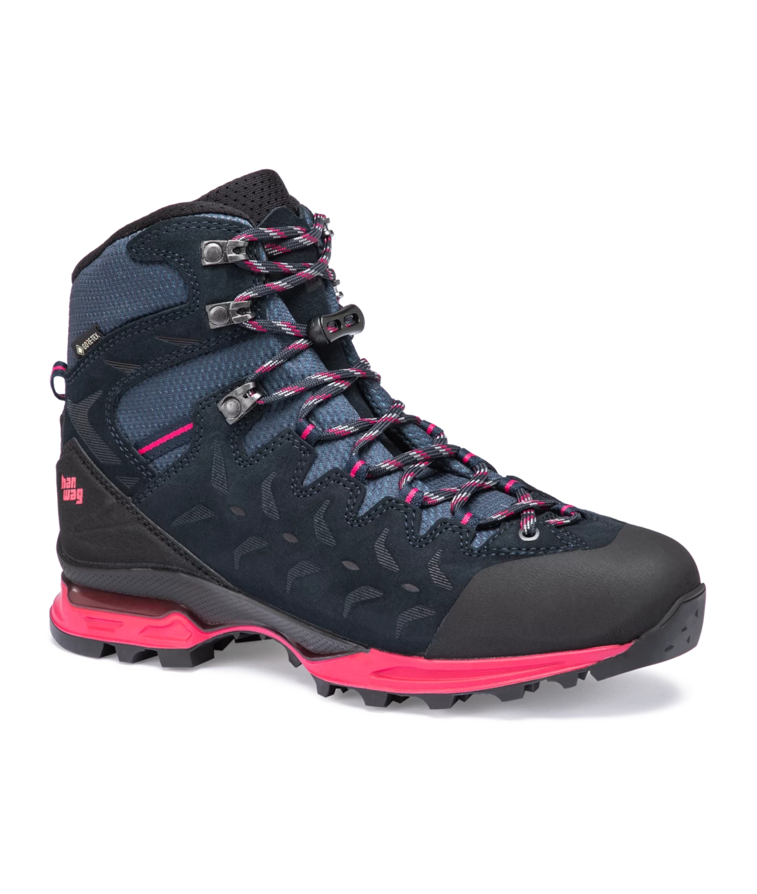 Der Makra Trek Lady GTX hat einen besonders farbenfrohen und sportlichen Look. Er ist der passende Schuh für anspruchsvolle Touren im Alpenraum – mit leichtem Gepäck und bis an die 3000-Meter-Höhenlinie. Dank spezieller Profilgestaltung und Hanwag 3D Prism Base Technologie hat der Schuh eine sehr leichte und komfortable Sohlenkonstruktion. Die Vibram Integral Light bietet perfekte Dämpfung bei hoher Stabilität, welche durch die niedrigere Standhöhe gewährleistet wird. Für einen verbesserten Fersenhalt sorgt „Hanwag 2 Zone Lock“: eine Fixierung mit einer mechanischen Klemme. Im Gegensatz zu einem herkömmlichen Klemmhaken blockiert die mechanische Klemme zuverlässig und kann nach dem Fixieren nicht mehr – ohne manuelles Zutun – verrutschen. Sie lässt sich mit nur einem Handgriff regulieren. Dank wasserdichter GORE-TEX Membran bleiben die Füße auch bei nassen Bedingungen trocken. Das Perwanger Leder ist robust, atmungsaktiv und langlebig. Eine Materialkombination, die auf ganzer Linie überzeugt.