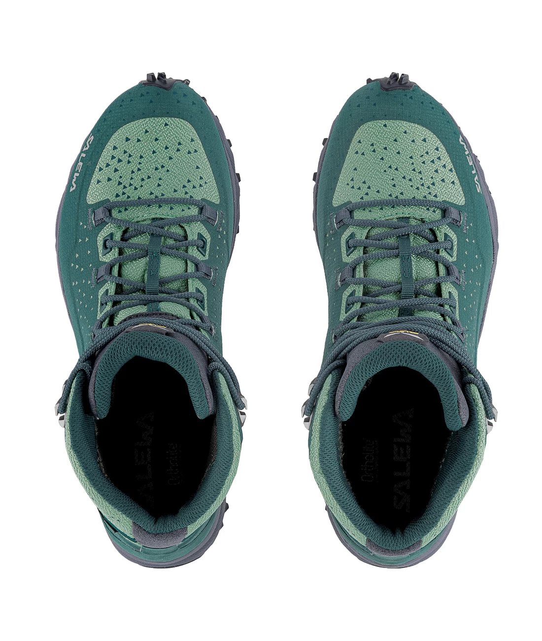 Die speziell für das Speed Hiking entwickelte Pomoca Außensohle beruht auf biomechanischen Forschungsergebnissen und unterstützt das Fußgewölbe und die natürliche Abrollbewegung.. Die Sohle fördert nicht nur ein natürliches Abrollen, sondern bietet außerdem eine hervorragende Bodenhaftung – bei Wind und Wetter gibt Ihnen das Profil mit seinen aggressiven Stollen und Kerben Sicherheit auf verschiedenstem Untergrund. Das charakteristische SALEWA 3F-System verbindet den Spannbereich mit Sohle und Ferse und garantiert so Flexibilität, einen präzisen Sitz und festen Halt für den Knöchel. Das gepolsterte OrthoLite® Fußbett leitet Feuchtigkeit ab und trägt dazu bei, dass Ihre Füße bei kühleren Bedingungen nicht kalt und klamm werden.