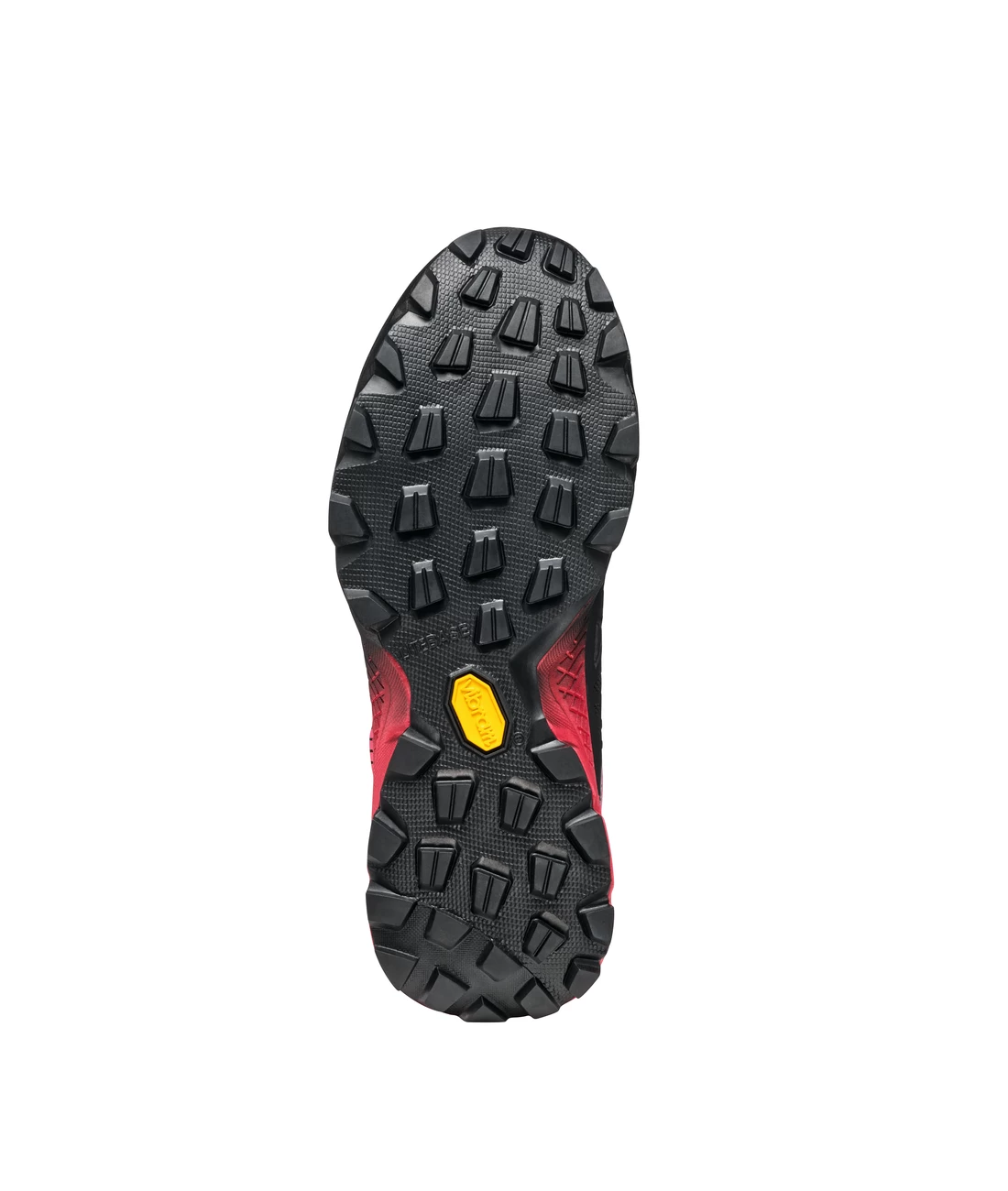 Sohle: VELOX LB MAX Sohle mit einem Dämpfungskeil aus EVA mit mittlerer Dichte und einem ergonomischem ESS Einsatz für Stabilität und Torsionssteifigkeit. Die Vibram® Lite Base Technologie reduziert die Dicke der Außensohle und bietet so mehr Sensibilität in steinigem Gelände. Hoher Grip in jedem Gelände dank der Vibram® Megagrip Gummimischung.