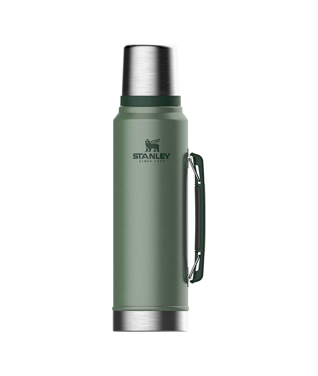 Die aus rostfreiem 18/8 Edelstahl gefertigte Stanley CLASSIC VAKUUMFLASCHE ist mit einer schützenden, grünen Hammerschlaglackierung versehen. Die doppelwandige Vakuum-Isolation hält Getränke bis zu 24 Stunden heiß oder kalt. Der seitlich montierte Kunststofftragegriff sorgt für den problemlosen Transport der Flasche. Über dem Flaschenverschluss sitzt ein Trinkbecher, der ebenfalls isolierend ausgelegt ist. Durch die 5 cm weite Öffnung lässt sich die Flasche sehr gut reinigen.