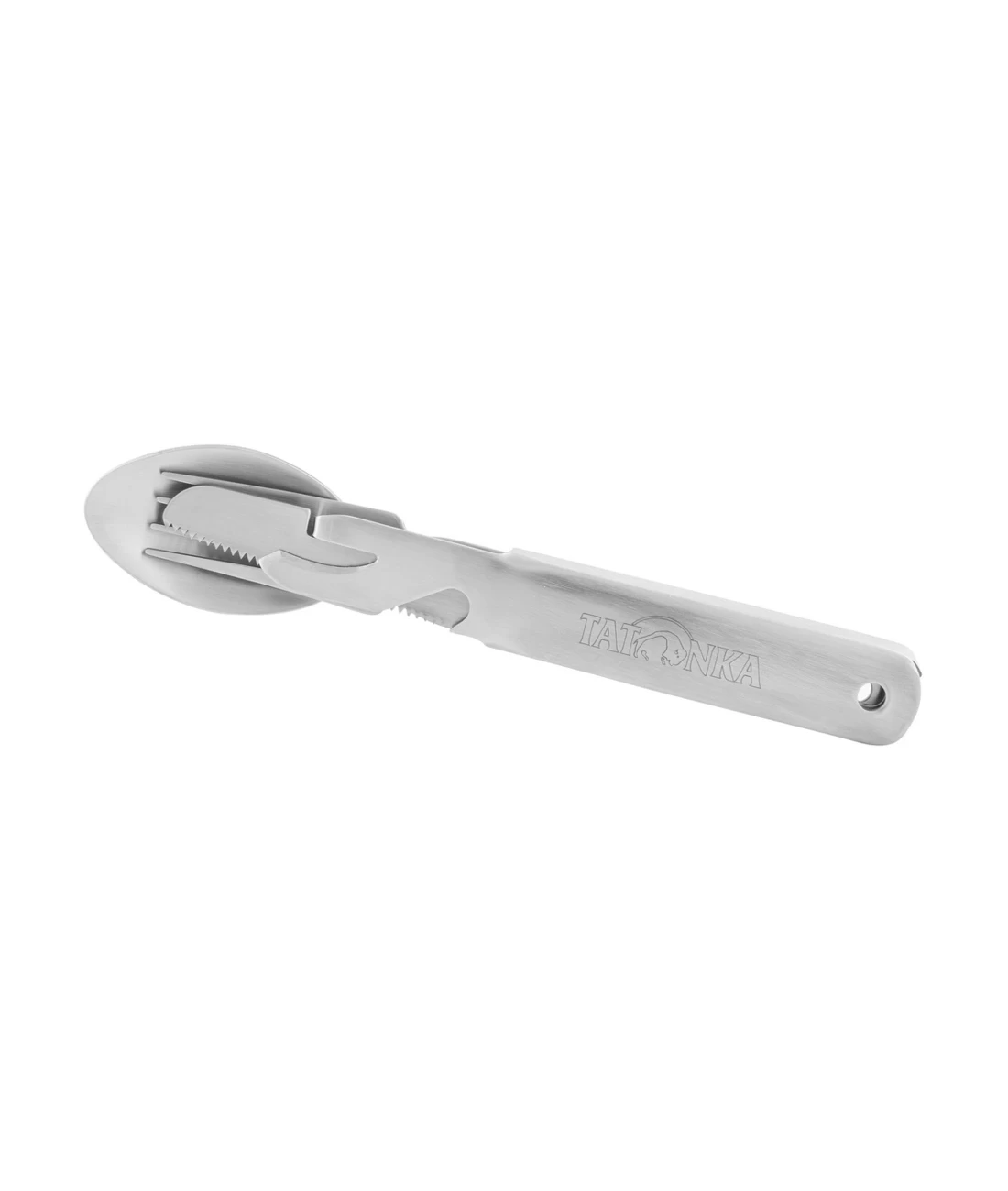 Platzsparendes, 4-teiliges Besteckset mit Hülle. Messer, Gabel, Löffel und Dosenöffner werden beim Transport einfach ineinandergesteckt.