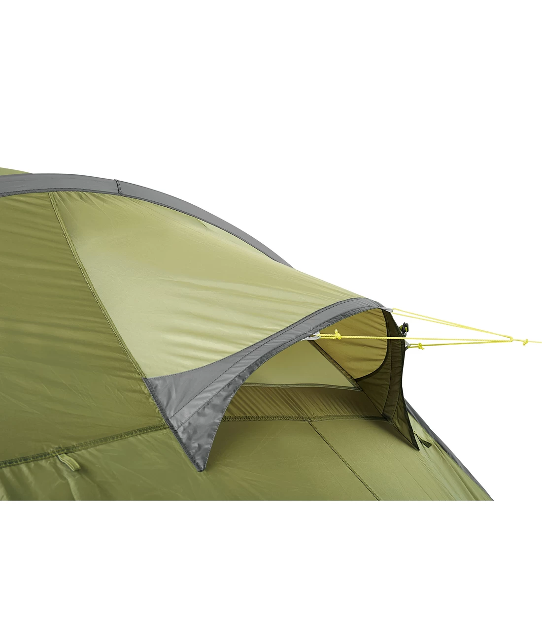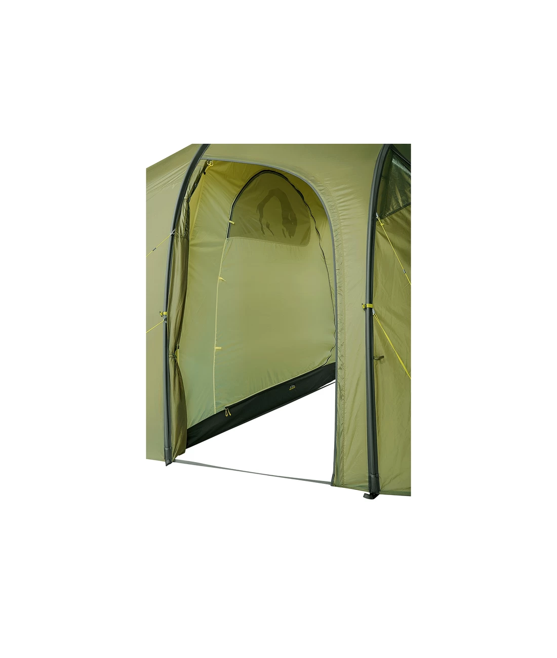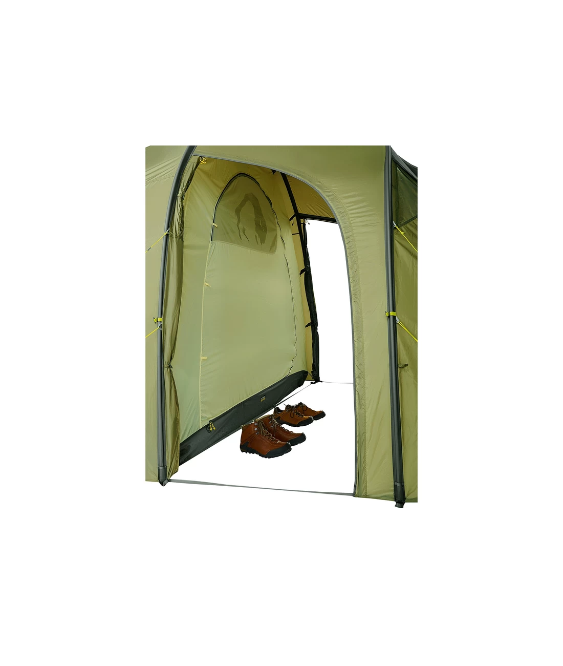 Familientaugliches Tunnelzelt mit geräumiger Schlafkabine und stehhoher Apsis. Herein in die richtig gute Stube geht es gleich über drei Eingänge – zwei an den Seiten des Vorzelts und einen unter der Apsis. Wer schon hier von den Dimensionen des Family Camp beeindruckt ist, sollte tief durchatmen, bevor er einen Blick in den großzügigen Schlafbereich wirft. Er bietet ausreichend Platz für drei bis vier Personen.