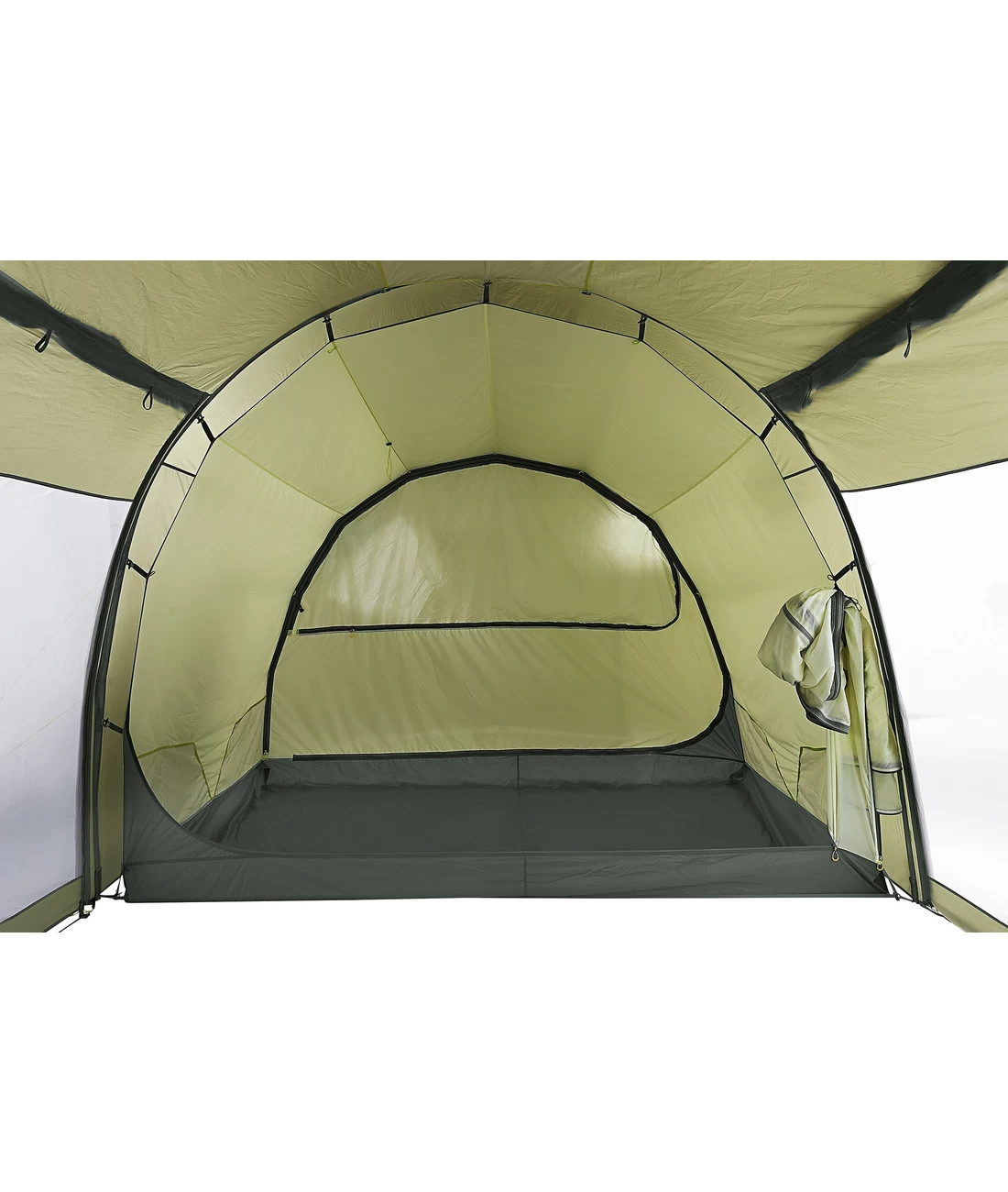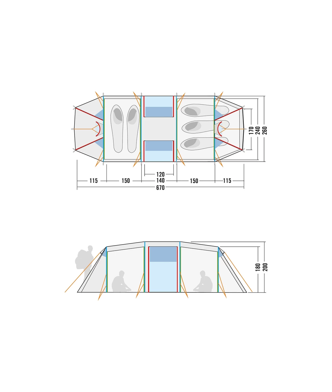 - Tunnelzelt mit vier Gestängebögen, zwei getrennten Schlafkabinen und zentraler, stehhoher Apsis