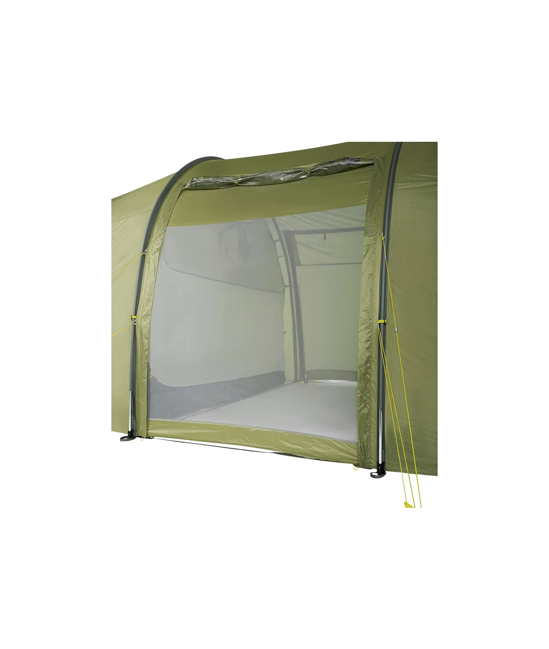 Luxusbehausung für Familien mit zwei geräumigen Schlafkabinen und großzügiger, stehhoher Apsis. Die stehhohe Konstruktion umfasst zwei große Schlafkabinen mit Moskitofenstern, eine 1,20 m breite, stehhohe Apsis in der Mitte und eine Apsis an der Stirnseite fürs Gepäck.