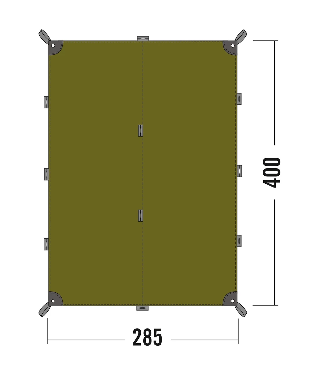 Zeltplane mit vielen Einsatzmöglichkeiten. Zu nutzen als rudimentäres Zelt, als Windschutz und Sonnensegel oder als Abdeckplane. Das Tarp 4 besteht aus beschichtetem Polyestergewebe, hat versiegelte Nähte und die Maße 285 x 400 cm.